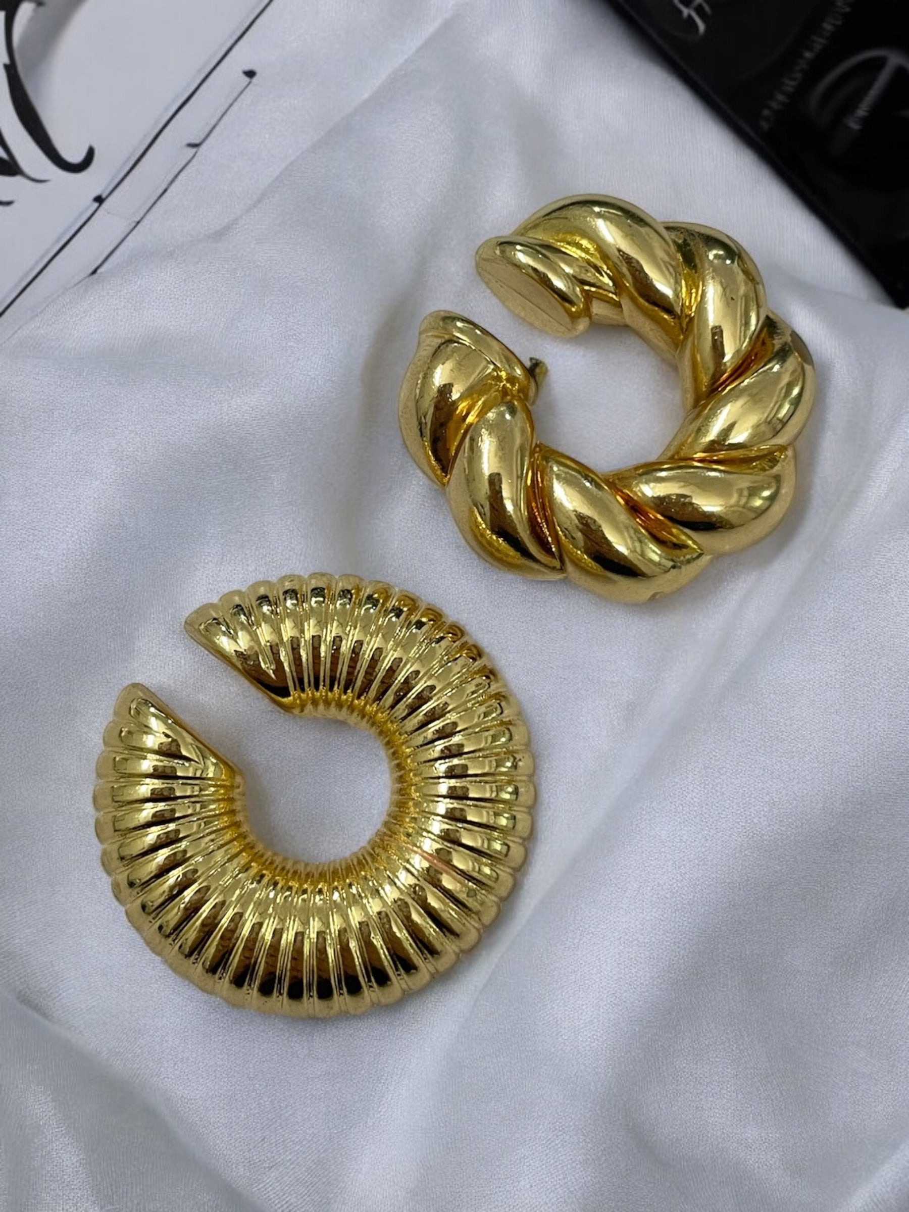 Set of 2 chunky gold ear cuffs in twisted and spiraled designs.