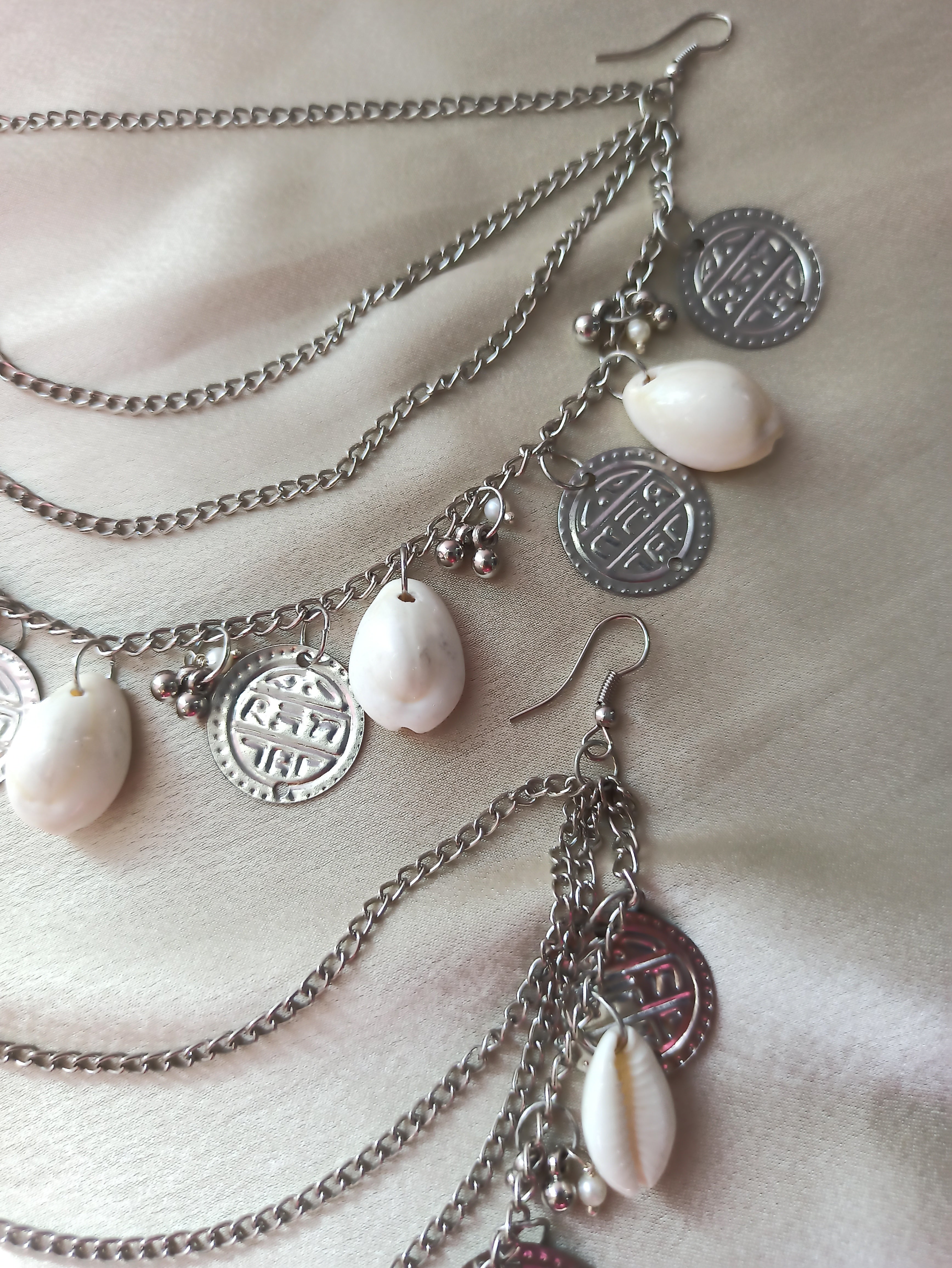 Statement kaanchain with silver chains, cowrie shells, and ethnic coin charms.