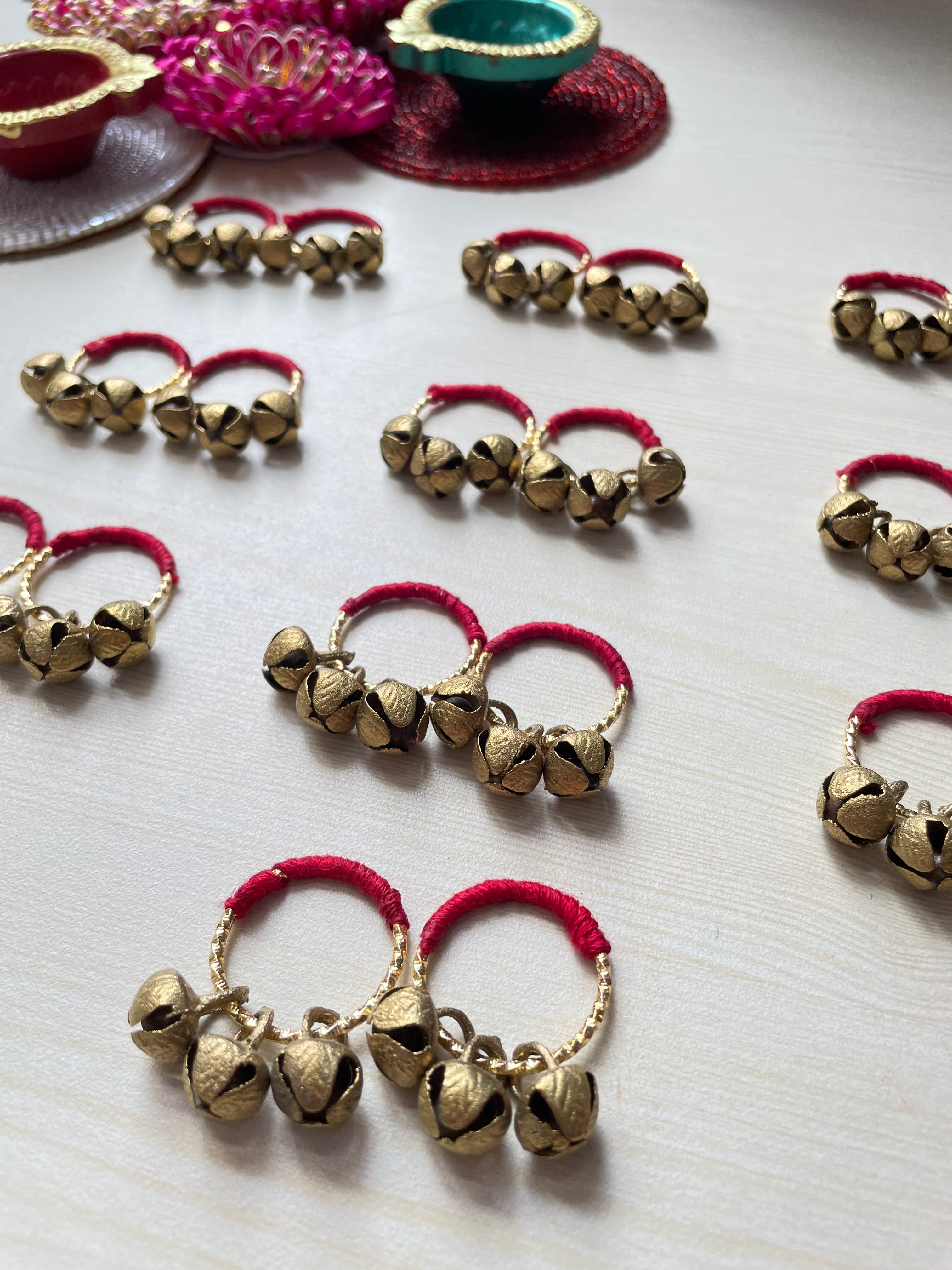 Introducing the Ghungroo Aarti Ring Pair, the perfect addition to your pooja routine. These rings feature traditional ghungroos, adding a musical element to your aarti ceremony. Size - 2.5cm diameter. It has a Loose fitting to fit every member of the family and for the ghunghroos to sound well.