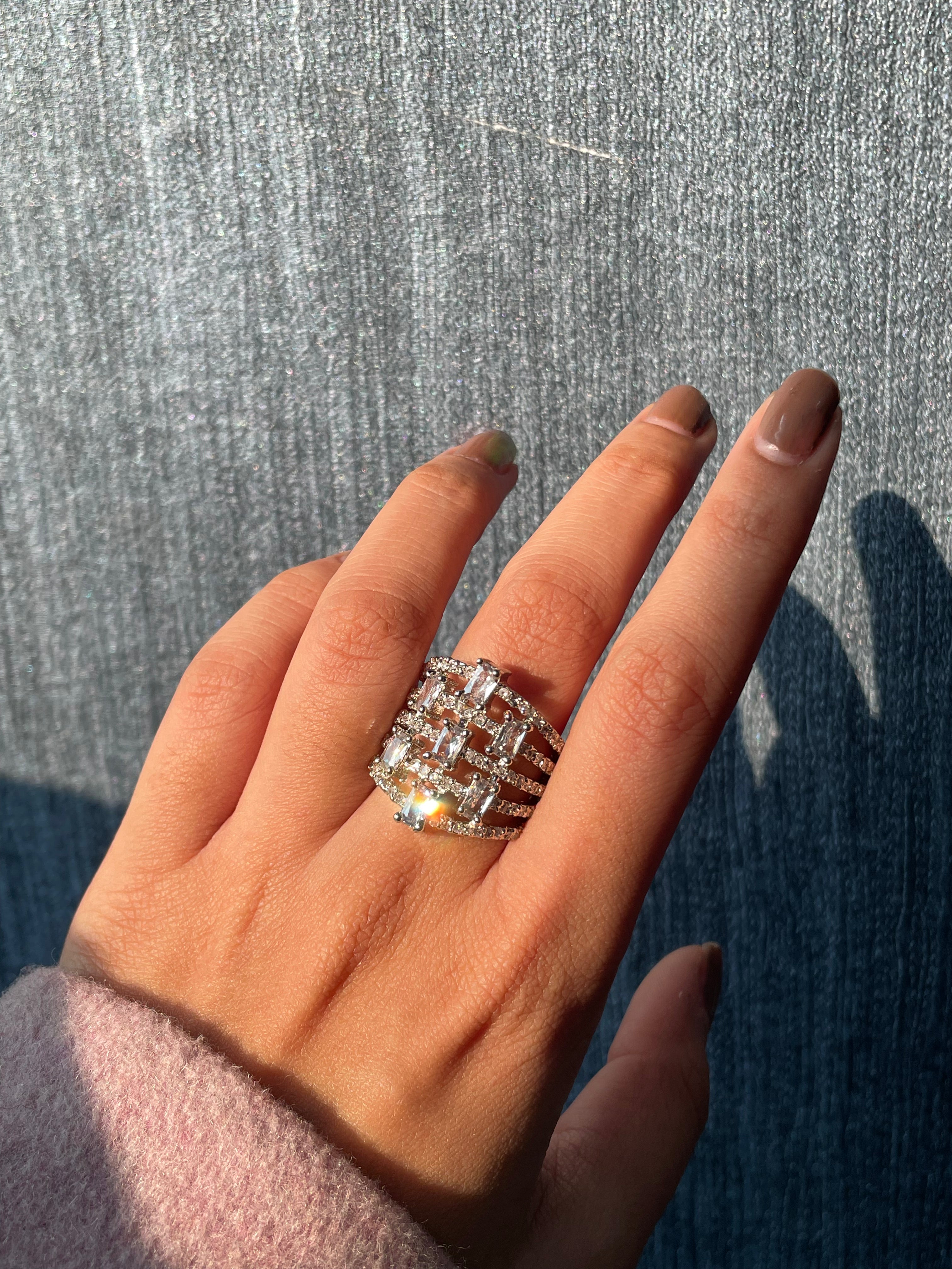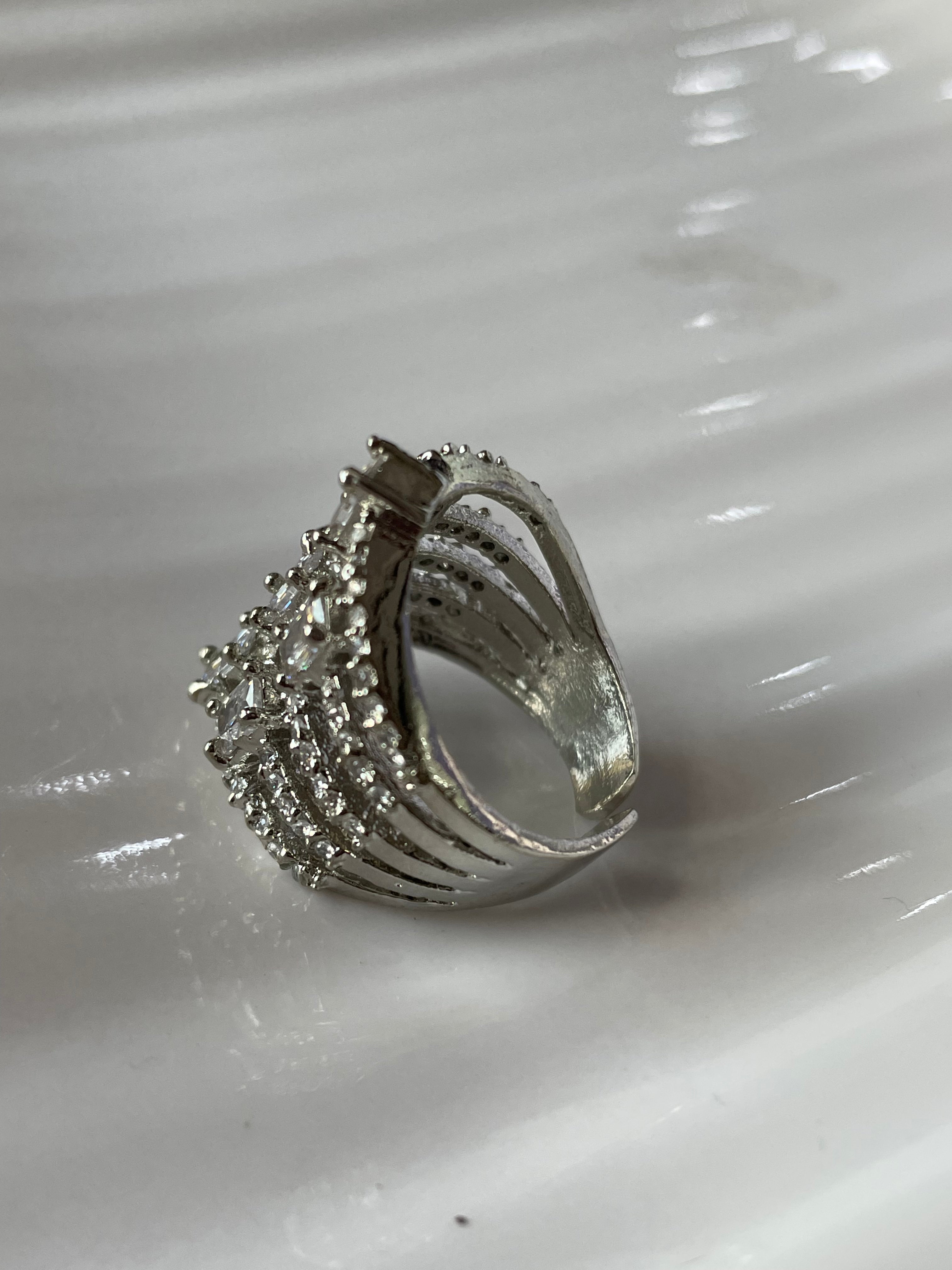 Sparkle and shine with our Diamond Cascade AD Ring! This glam and unique ring is adjustable in size, ensuring the perfect fit for every finger. Add some sparkle to any outfit with this playful and eye-catching accessory.