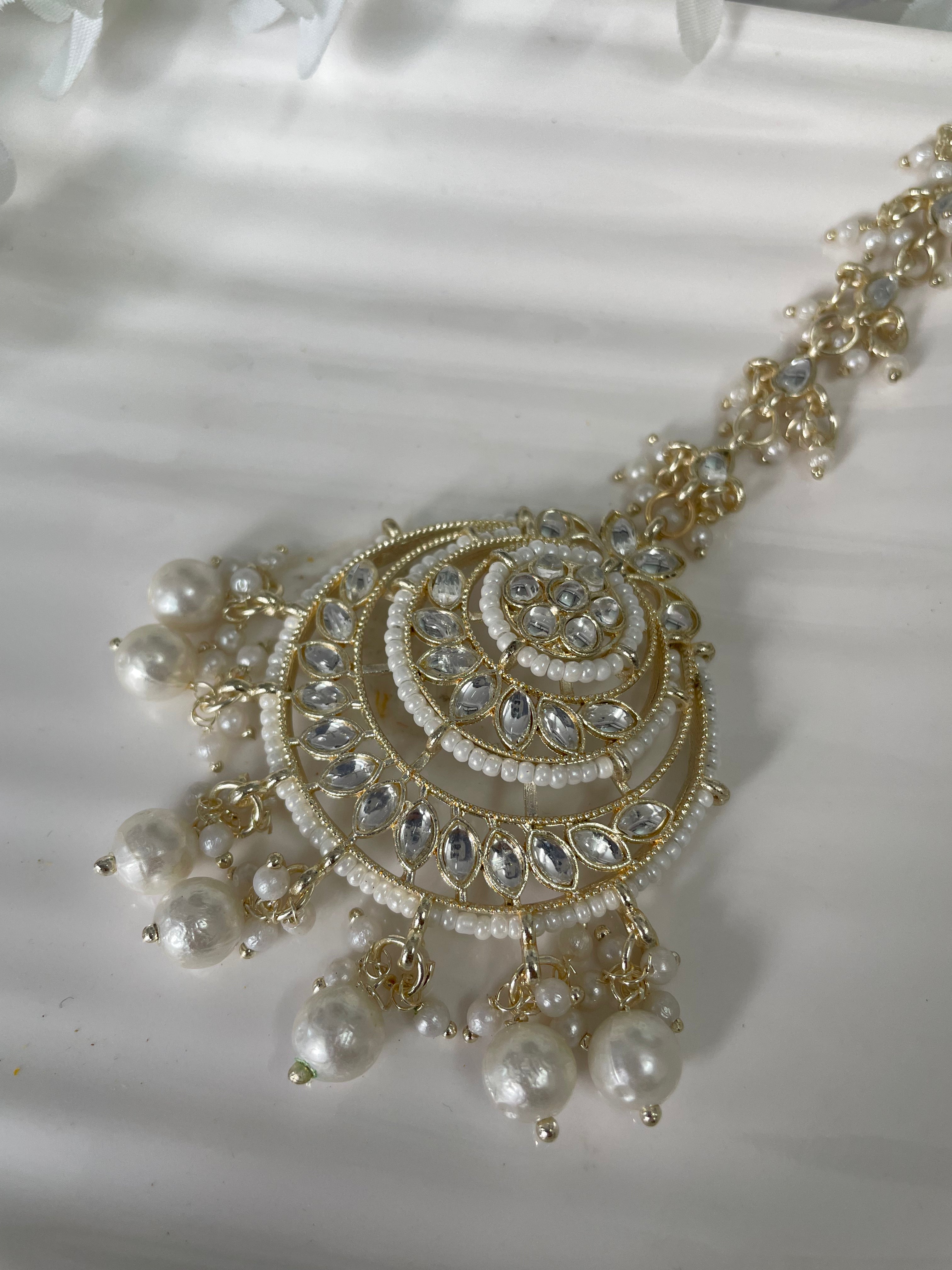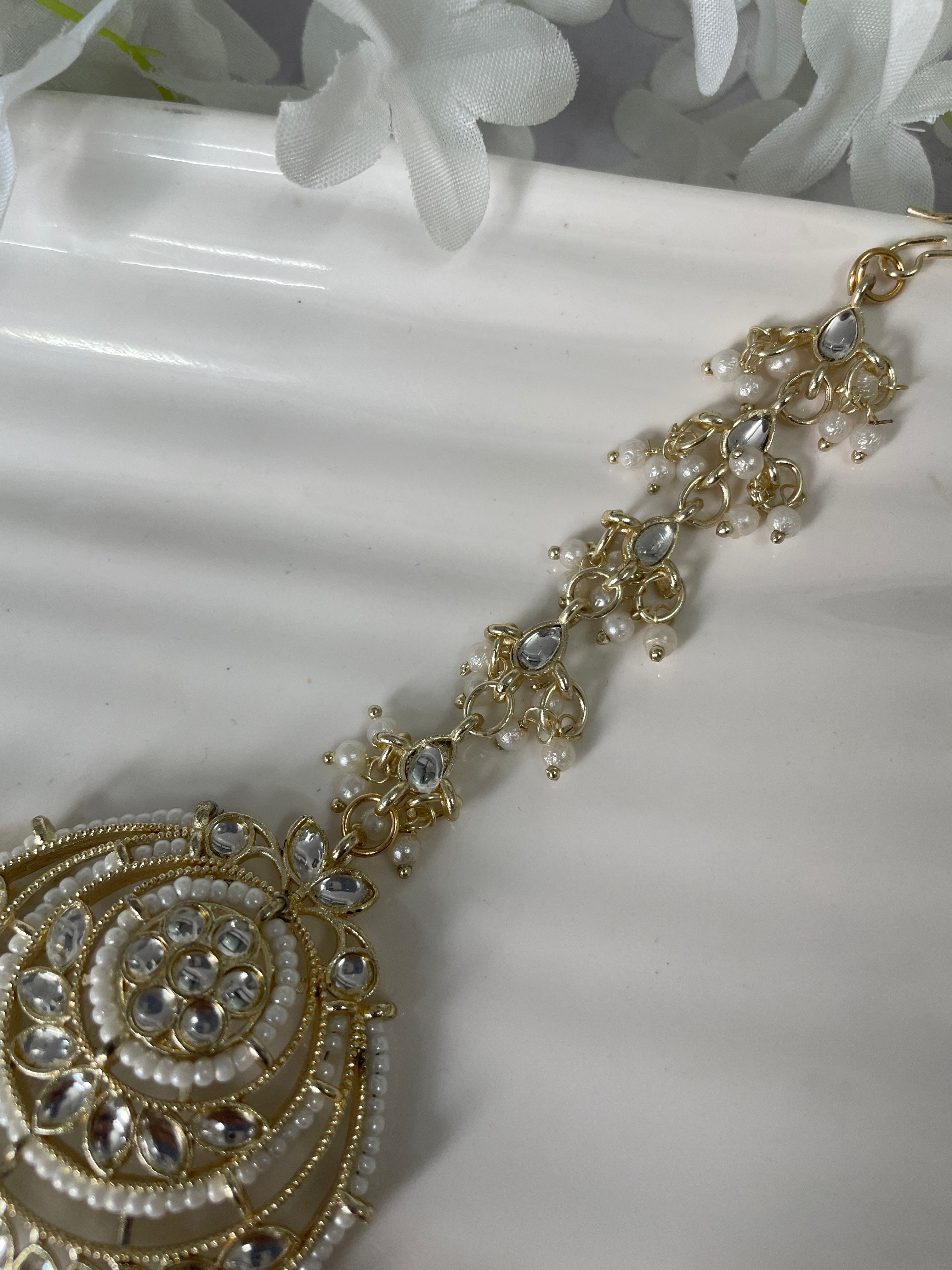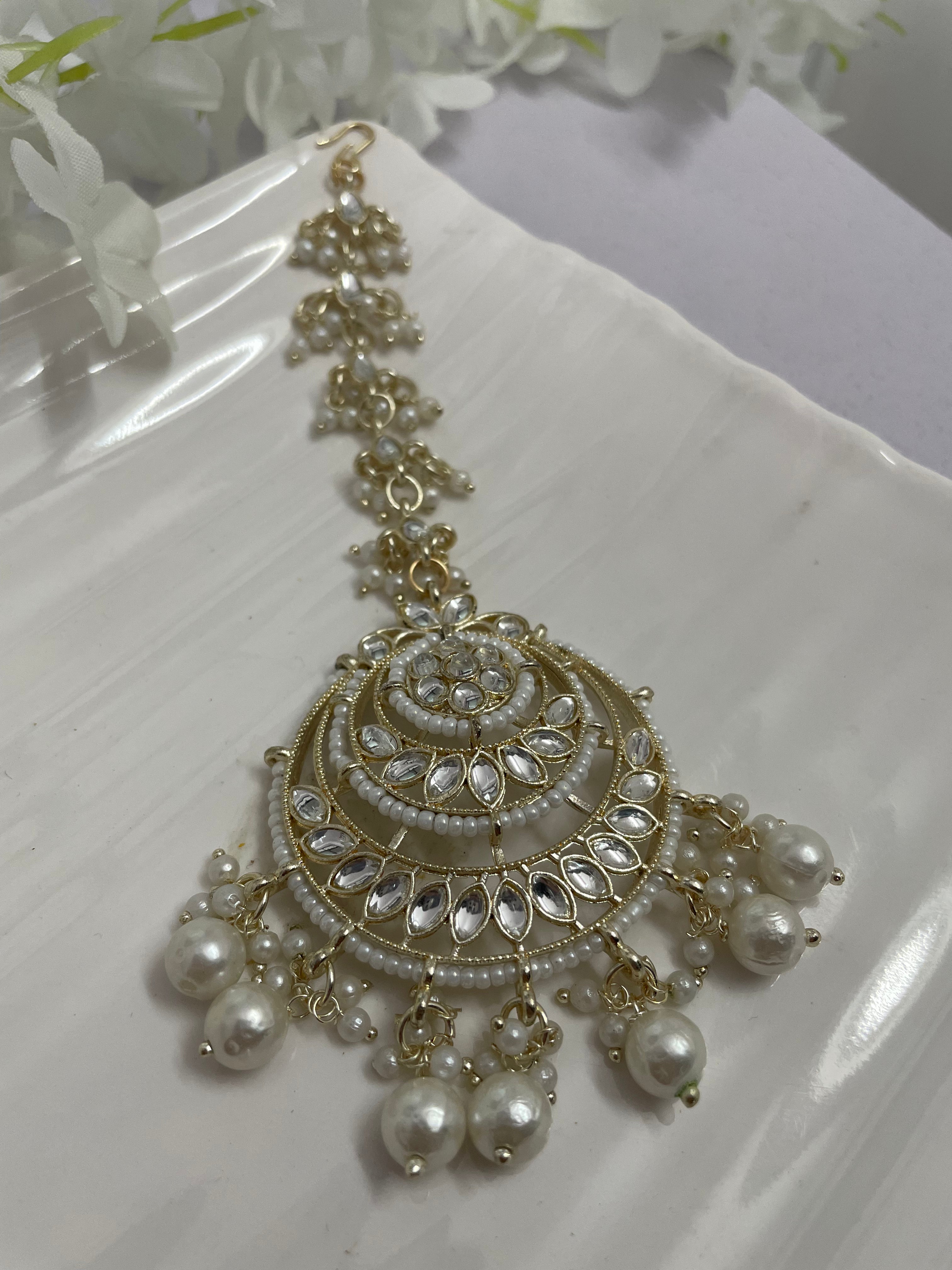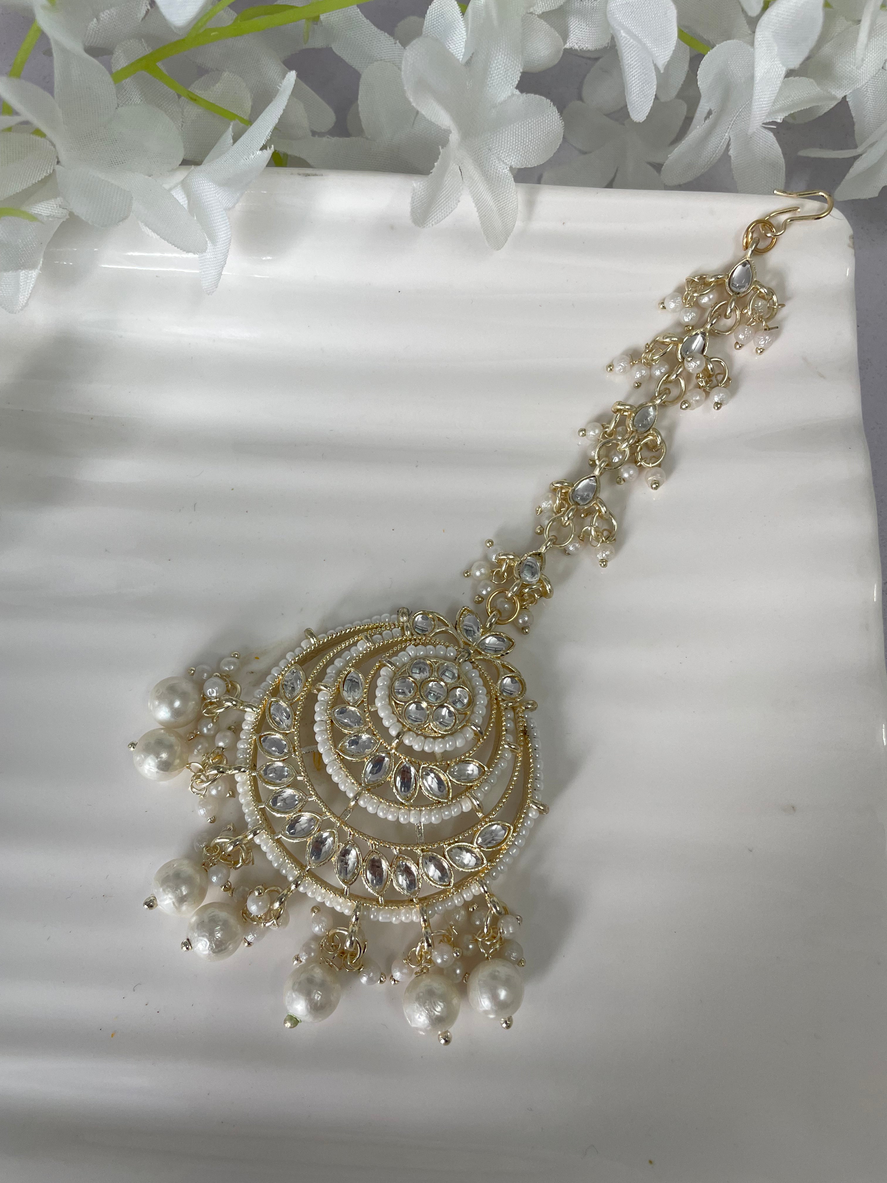 This festive Alokik Kundan Maang Tikka is the perfect accessory to make any occasion special! Adorned with ornate details and exquisite kundan stones, it adds a touch of sparkle to any look. Get ready to shine brighter than the stars!