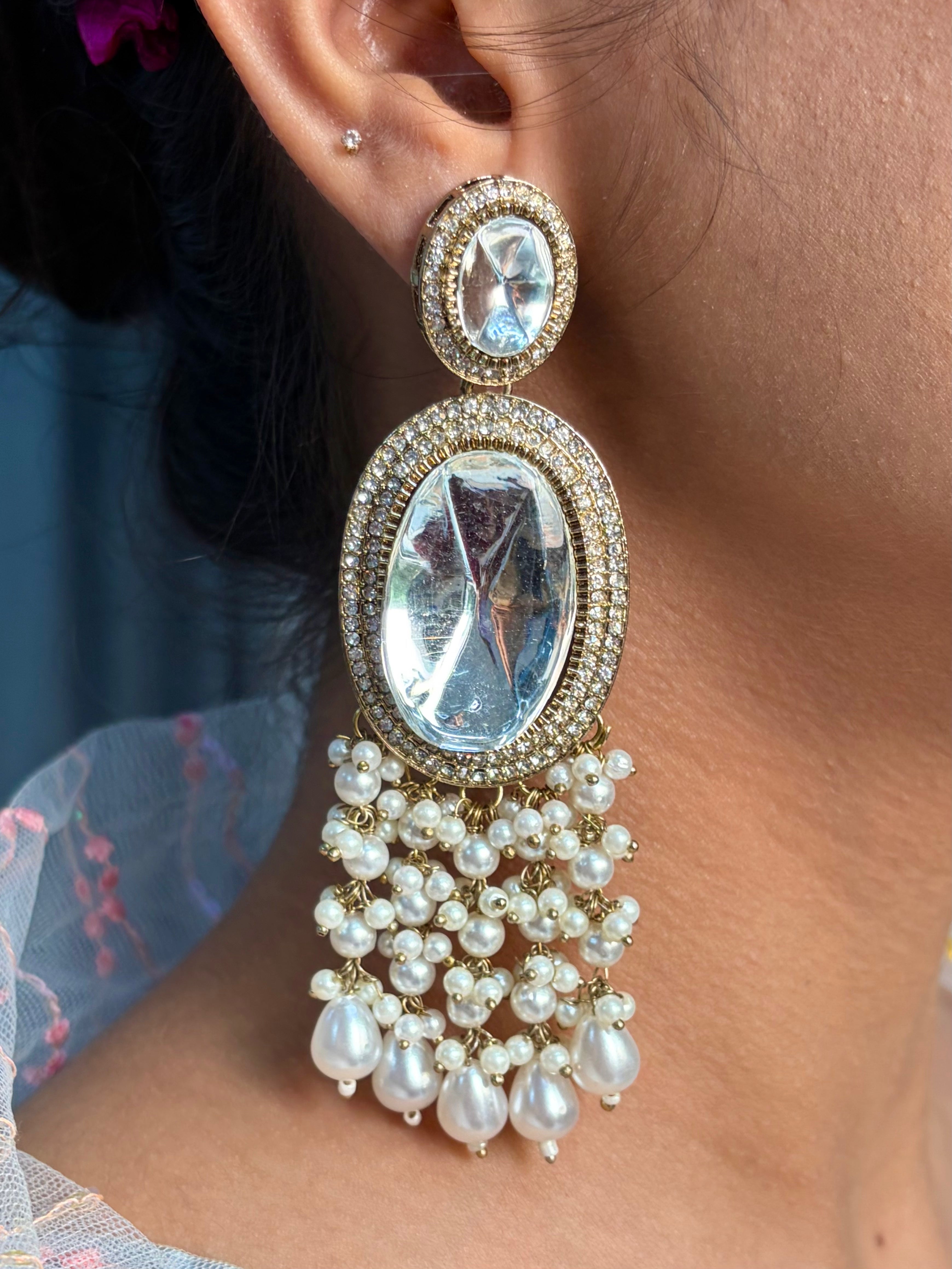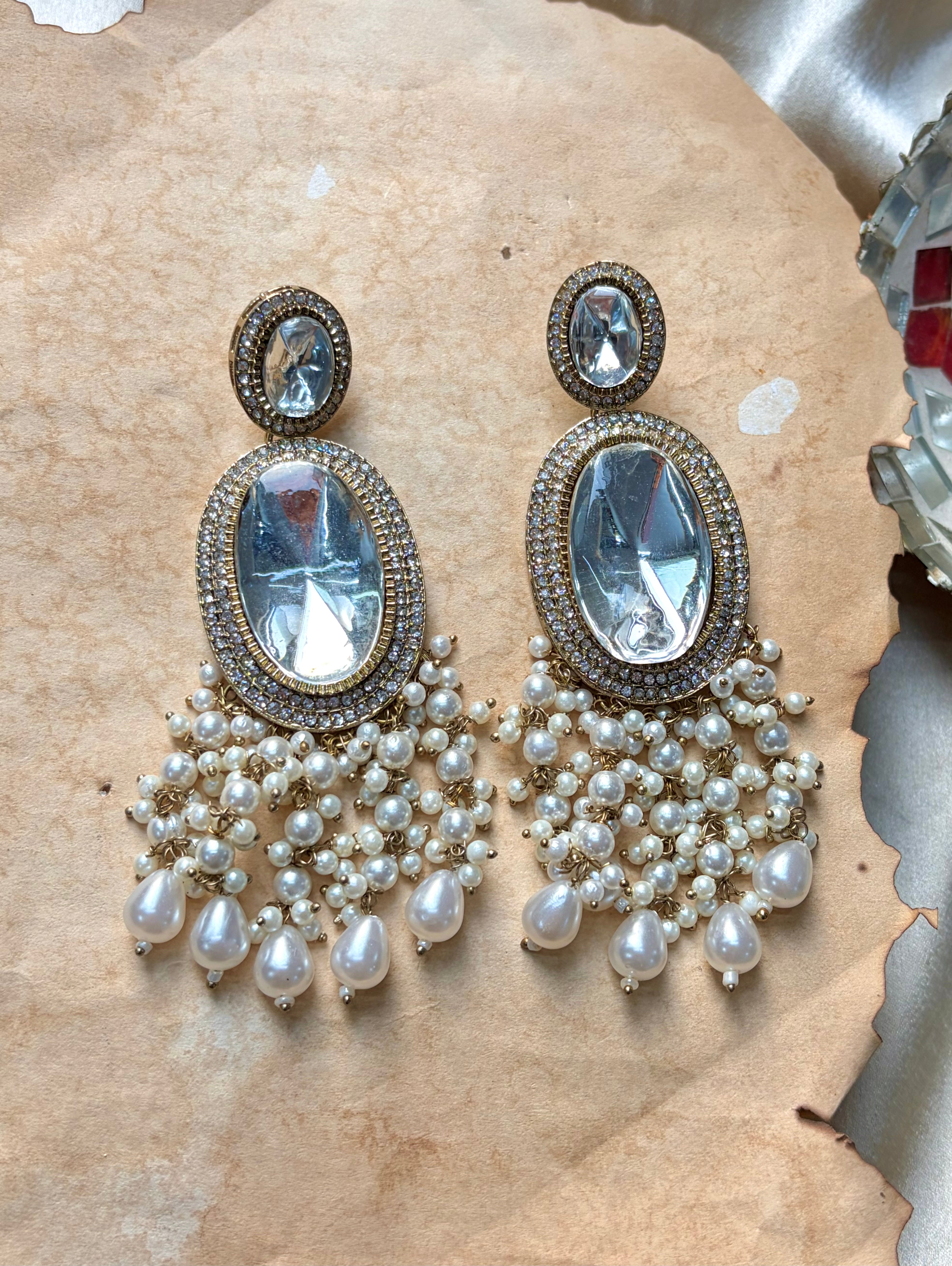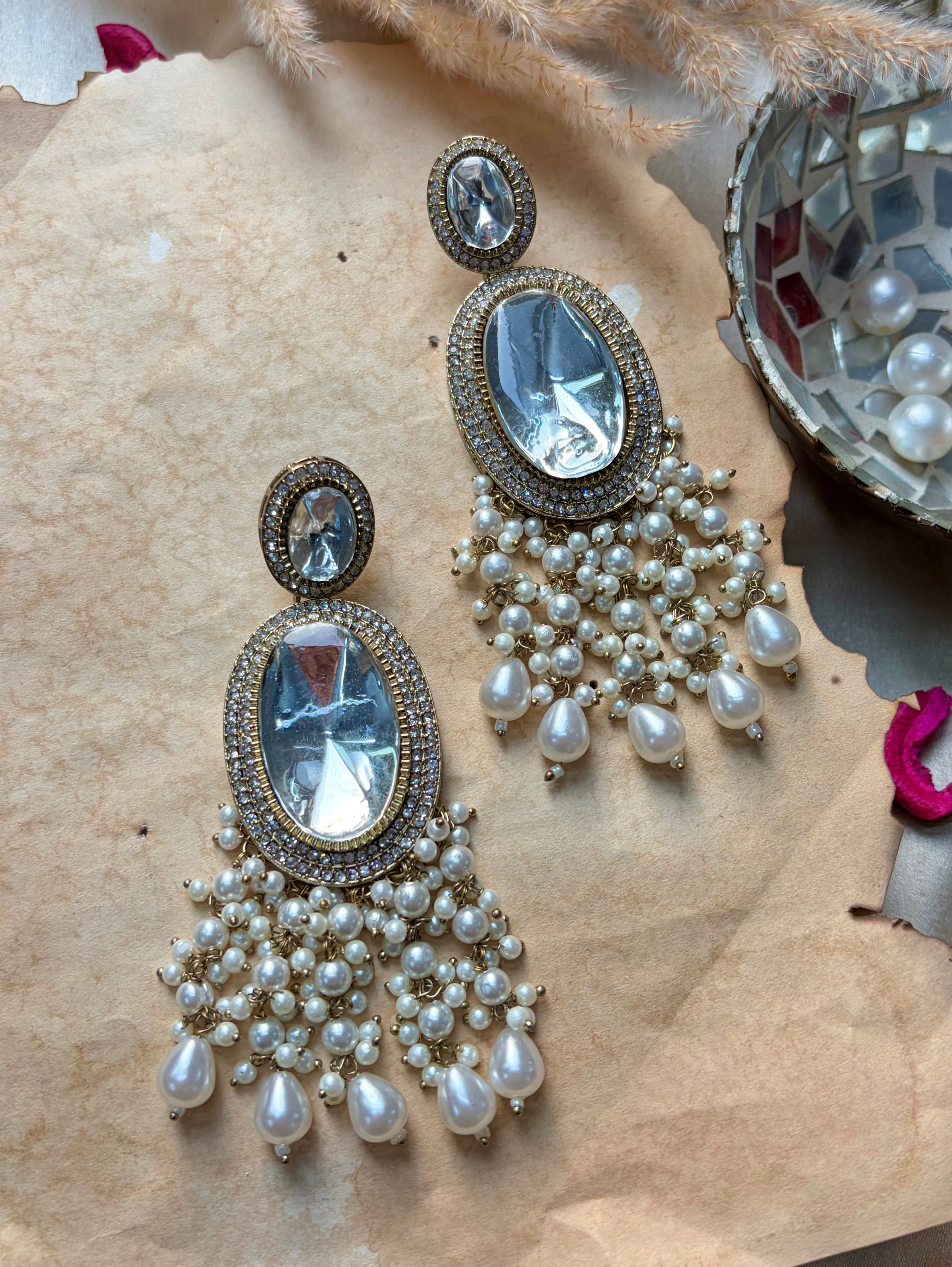 The Devyani Kundan Earrings are designed to give you a rich, traditional, and festive look. Featuring a beautiful combination of kundan stones, a large mirror centerpiece, and layers of pearl drops, these earrings add an instant royal touch to any outfit. Perfect for weddings, festivals, and grand celebrations, they make a bold and elegant statement.