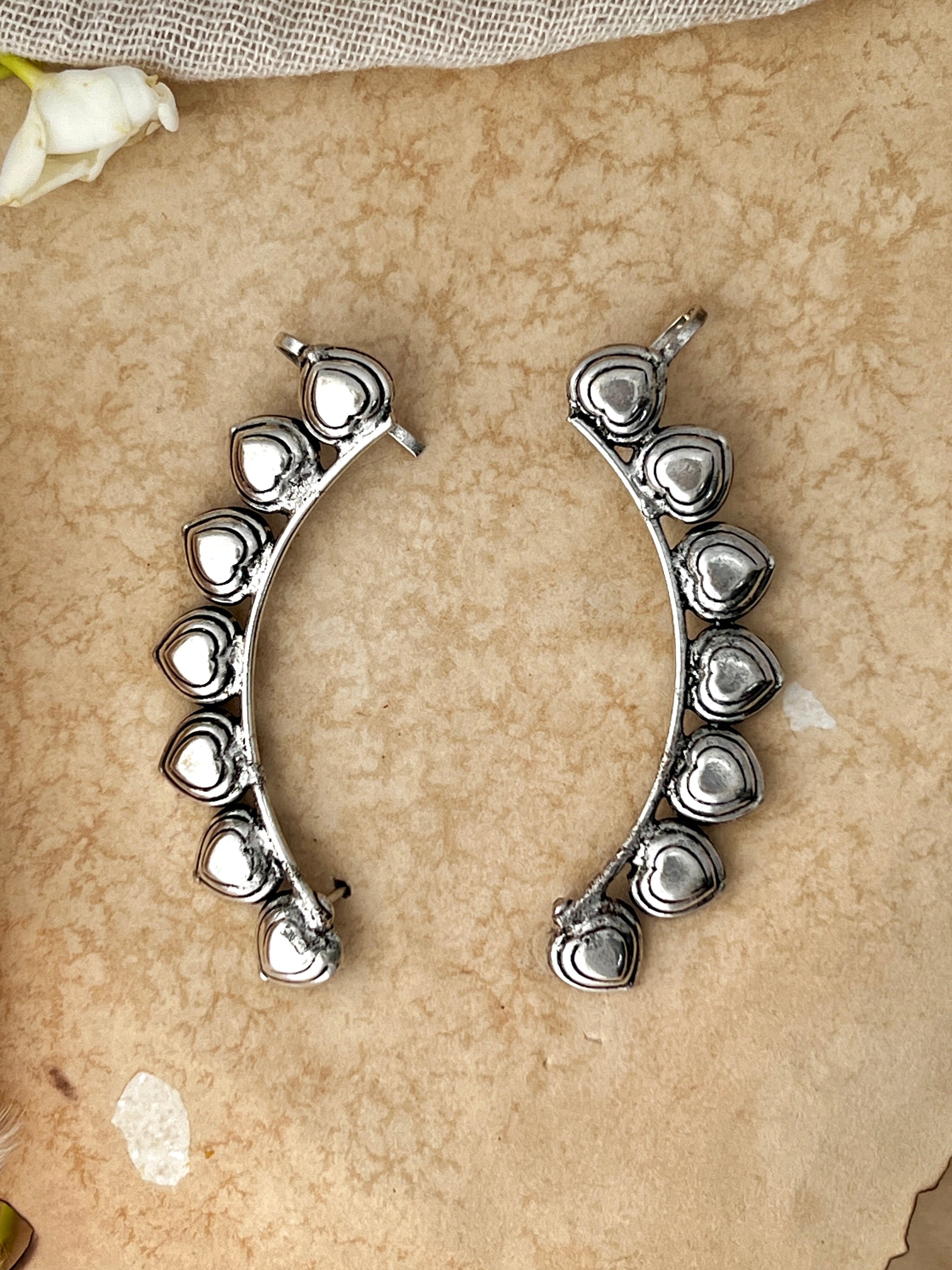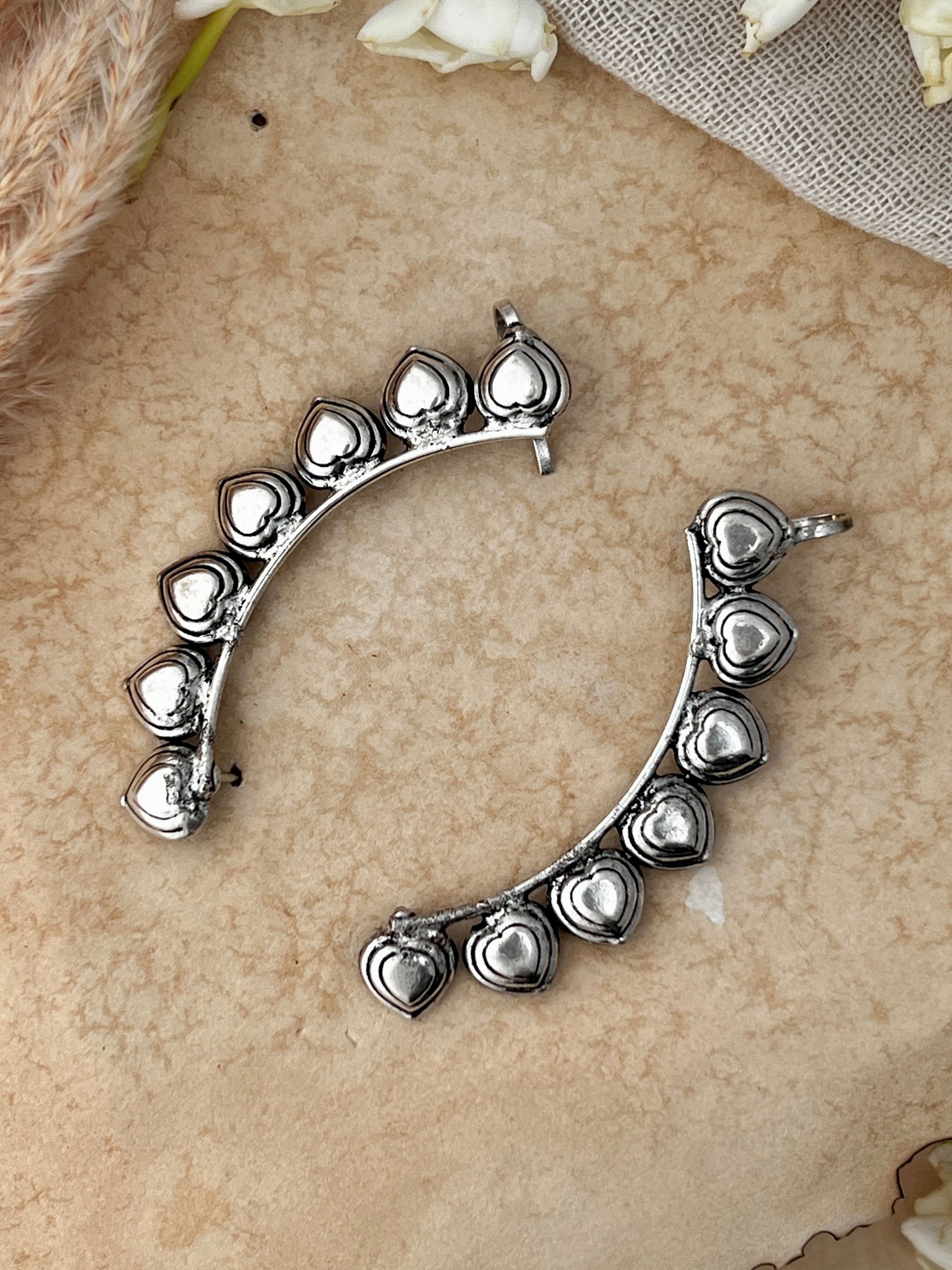 The Dilraaz Oxidised Earcuff features a line-up of embossed oxidised silver hearts that climb along your ear.