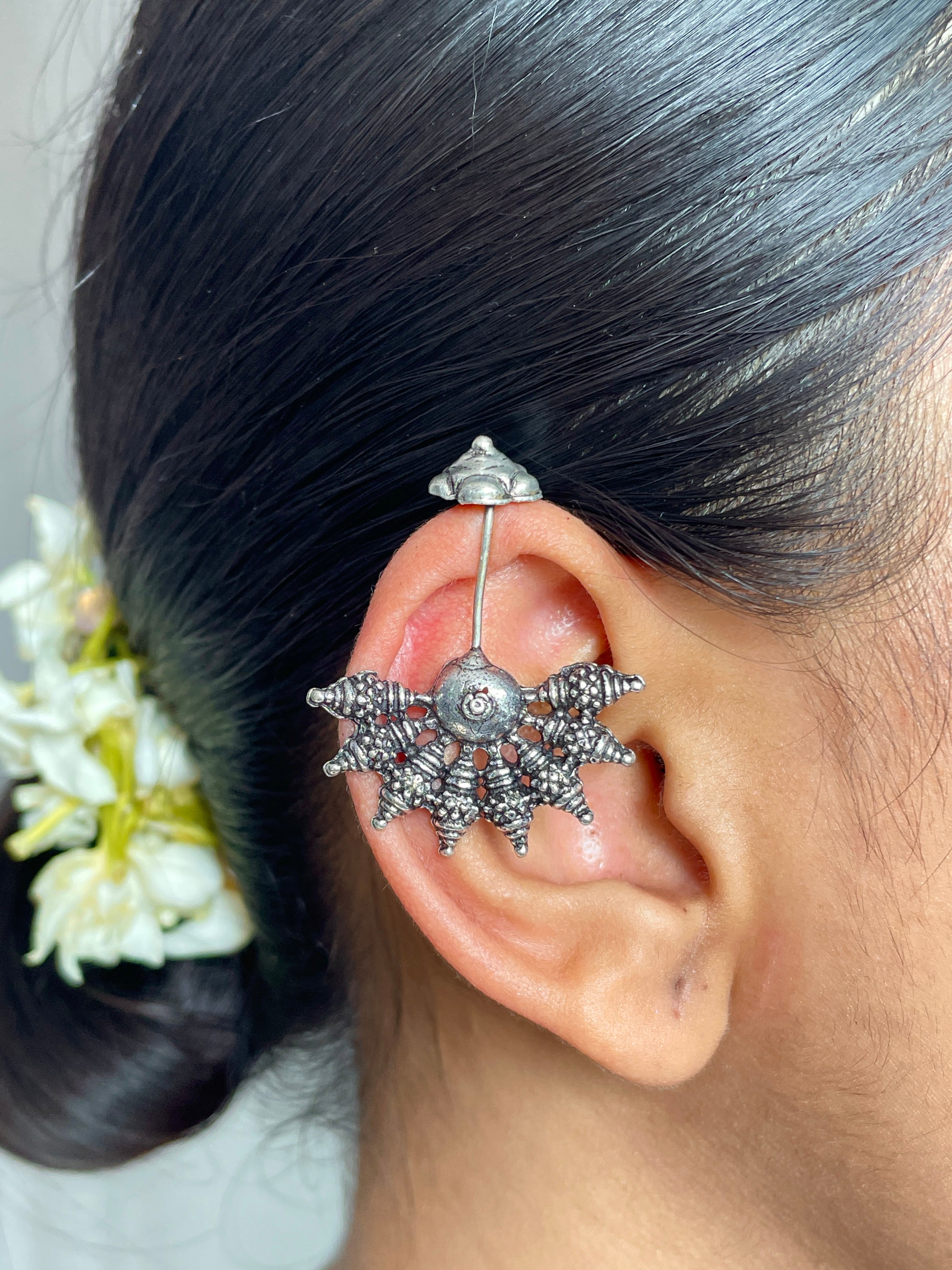 This piece is a classic oxidised Pankh Bugadi Earcuff jaali-style cutwork with oxidised silver detailing.