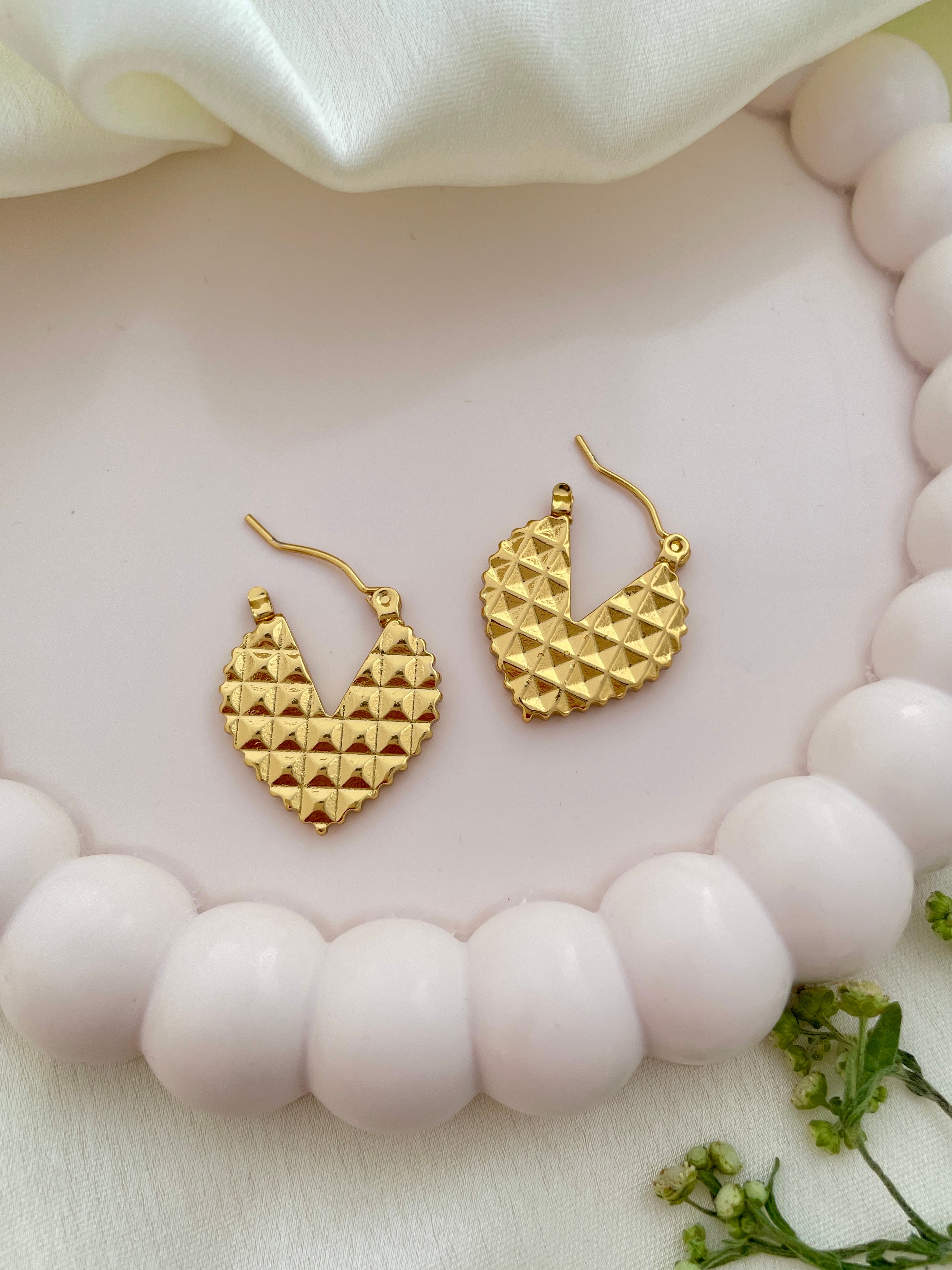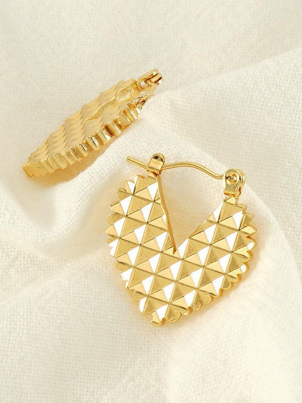 A must-have statement piece for every jewelry lover. Stylish gold-toned hoops with a bold heart shape and geometric texture.