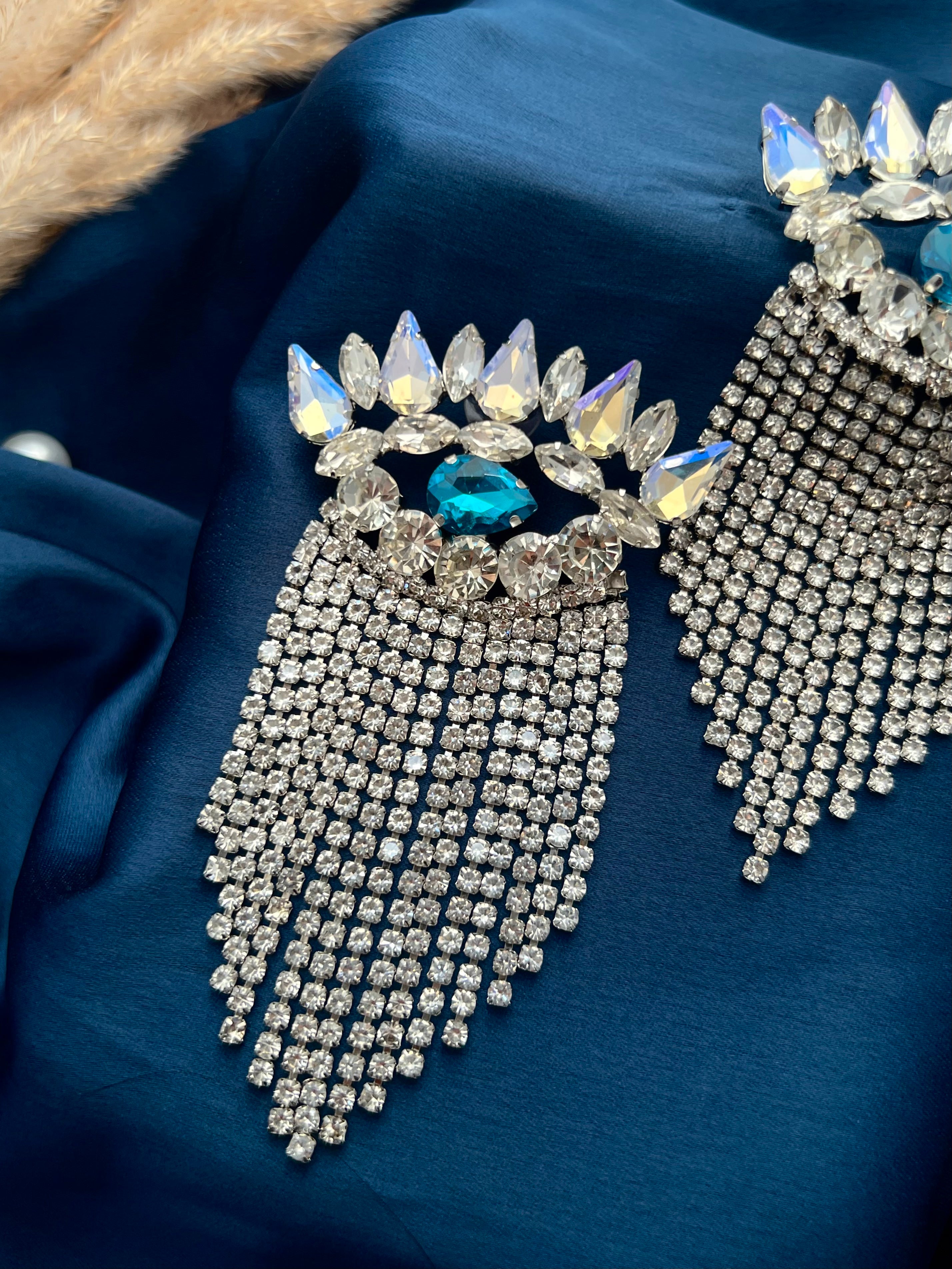 These glamorous earrings are designed with sparkling silver rhinestones, eye-catching blue crystal stones, and long dangling tassels that shine with every move. Perfect for parties, weddings, and festive nights, they are made to grab all the attention.