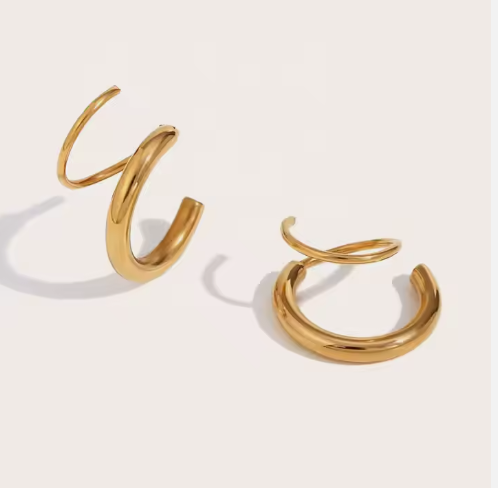 Two is better than one with our Double Layered Hoops! These gold hoops create the illusion of a double piercing without the pain. Chic and stylish, they're perfect for adding a touch of edge to your look. Upgrade your earring game and turn heads with these unique hoops. Twist for a perfect double piercing look. No need to commit, easily adjustable for any size.