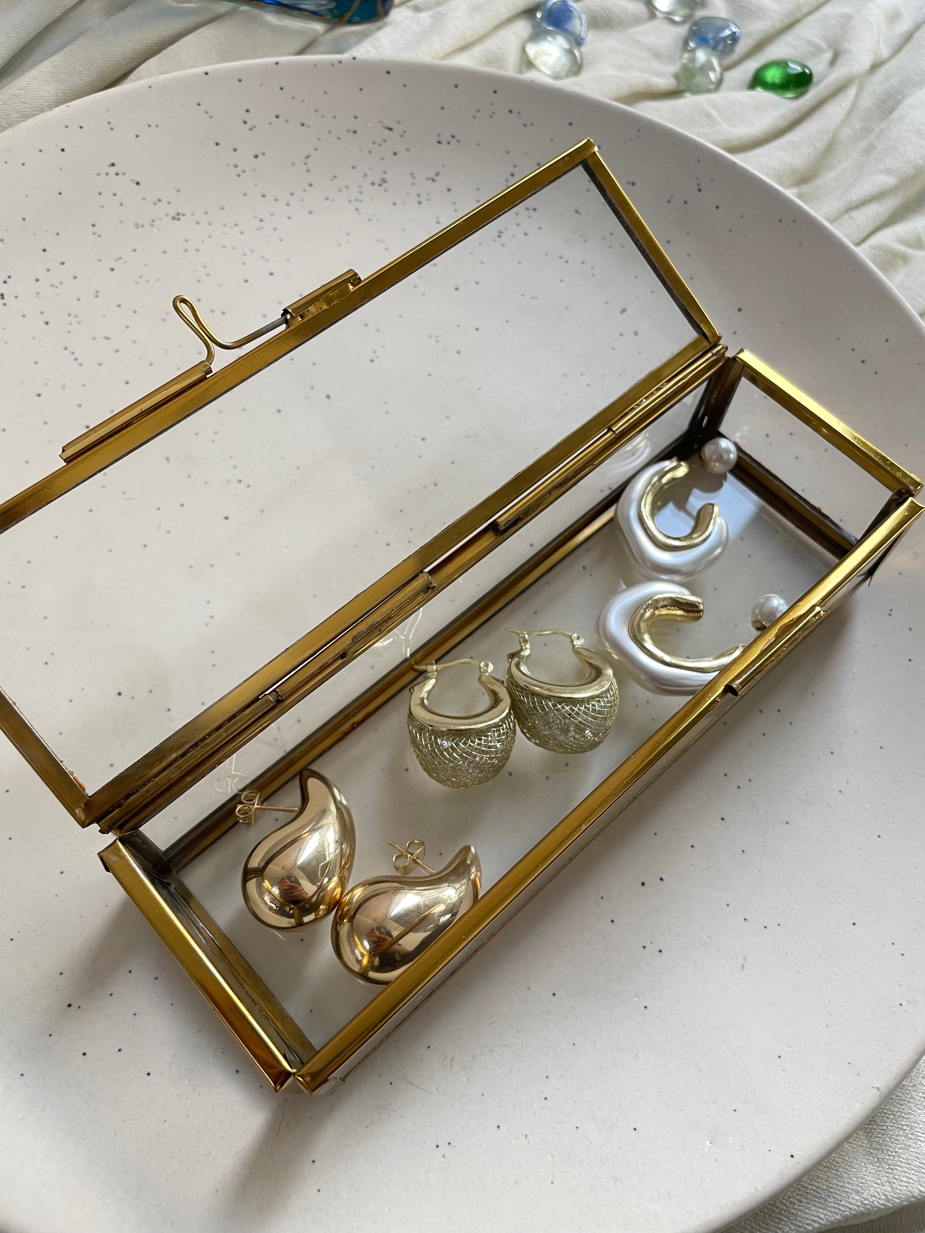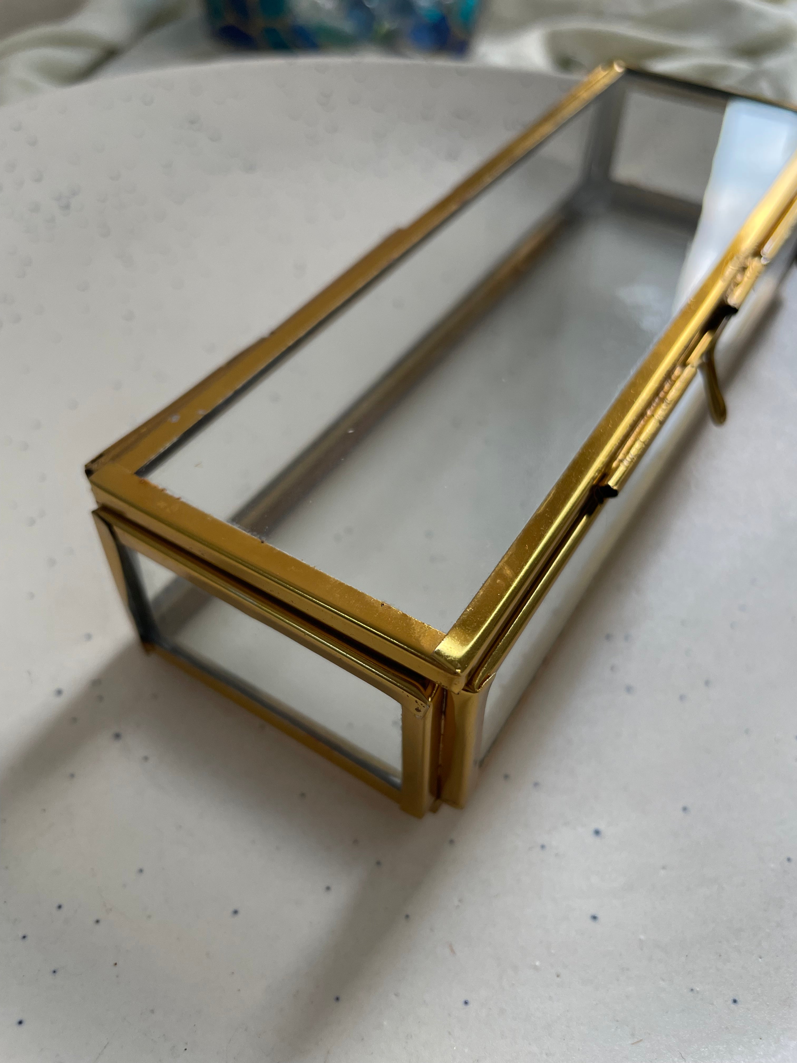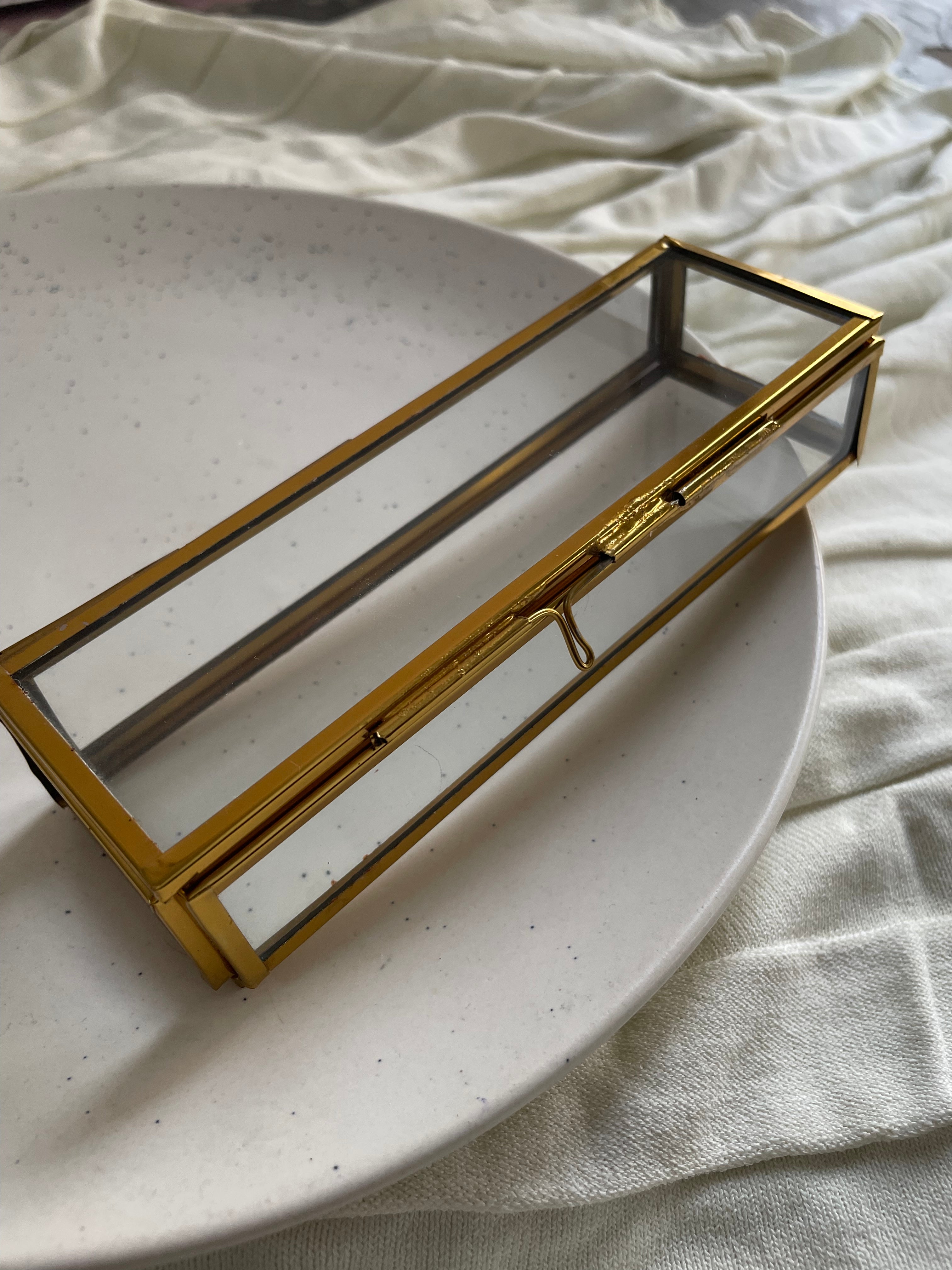 किसी भी कमरे के लिए एक शानदार अतिरिक्त, यह लक्स ग्लास बॉक्स कीमती गहने या किसी अन्य आवश्यक सामान को संग्रहीत करने के लिए एकदम सही है। पीतल के फ्रेमिंग के साथ सुरुचिपूर्ण ग्लास से तैयार, यह एक प्रभावशाली डिस्प्ले पीस है जो हर किसी को ईर्ष्यालु बना देगा! यह आपके प्रियजनों के लिए कुछ पैक करने के लिए एक आदर्श उपहार है। यह आपके वैनिटी के लिए एक बहुउद्देशीय अतिरिक्त है।
