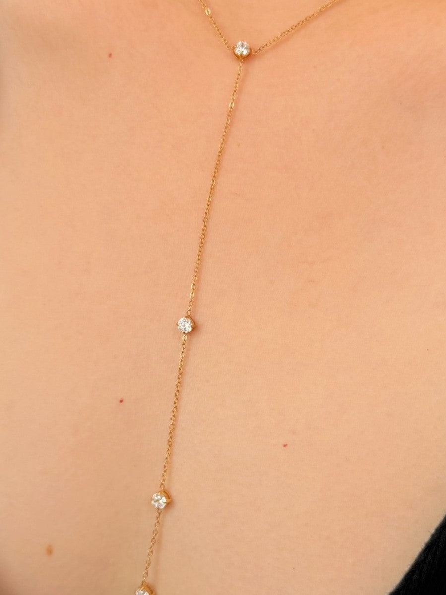 This dainty gold body chain, dotted with shimmering crystal charms, is your go-to for layering chic and playful.