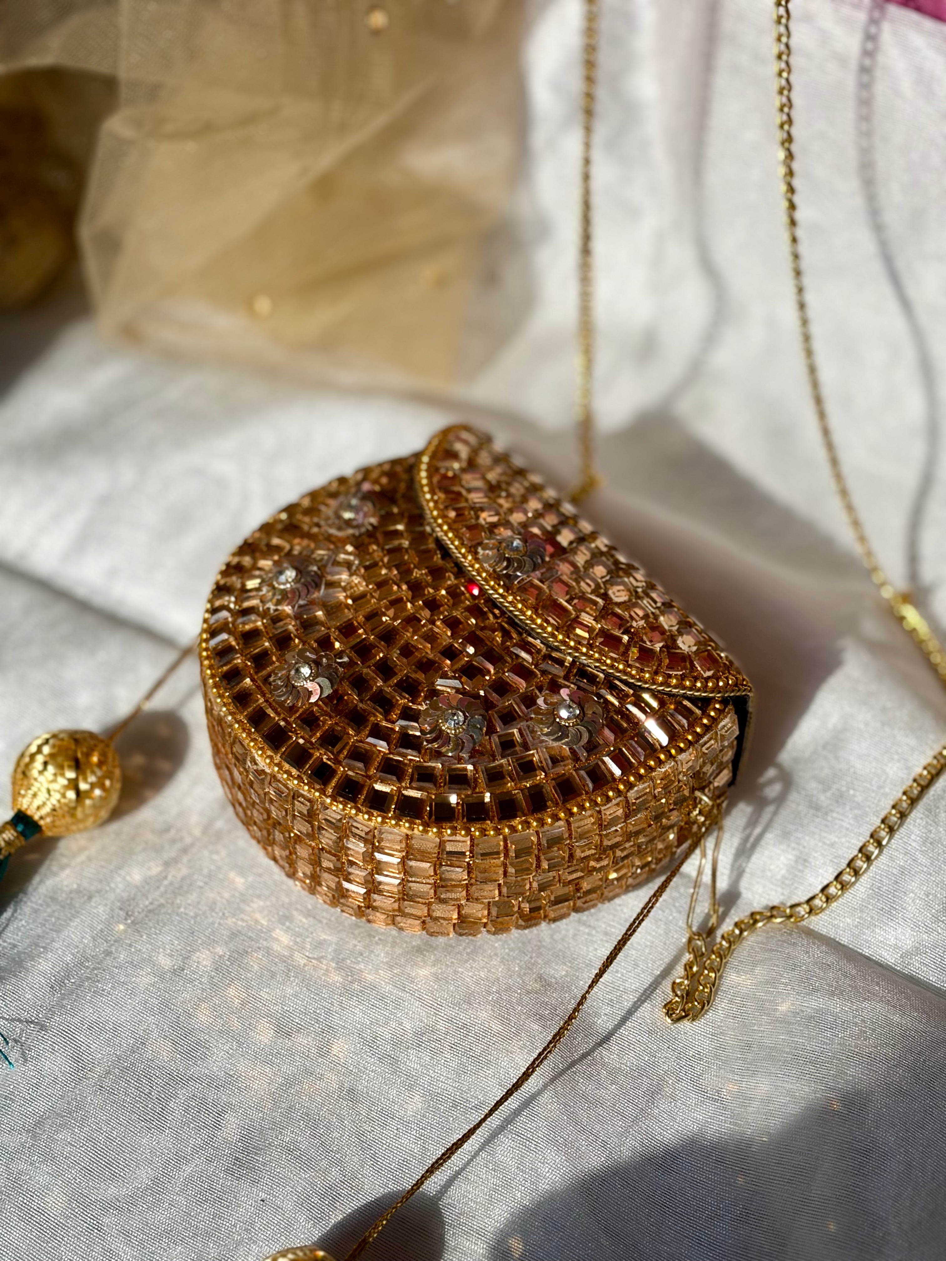 The Sheesh Mini Bag blends traditional charm with modern elegance. Handcrafted with mirror work, golden sequins, and colorful tassels, it adds a sparkling touch to any festive or party look.