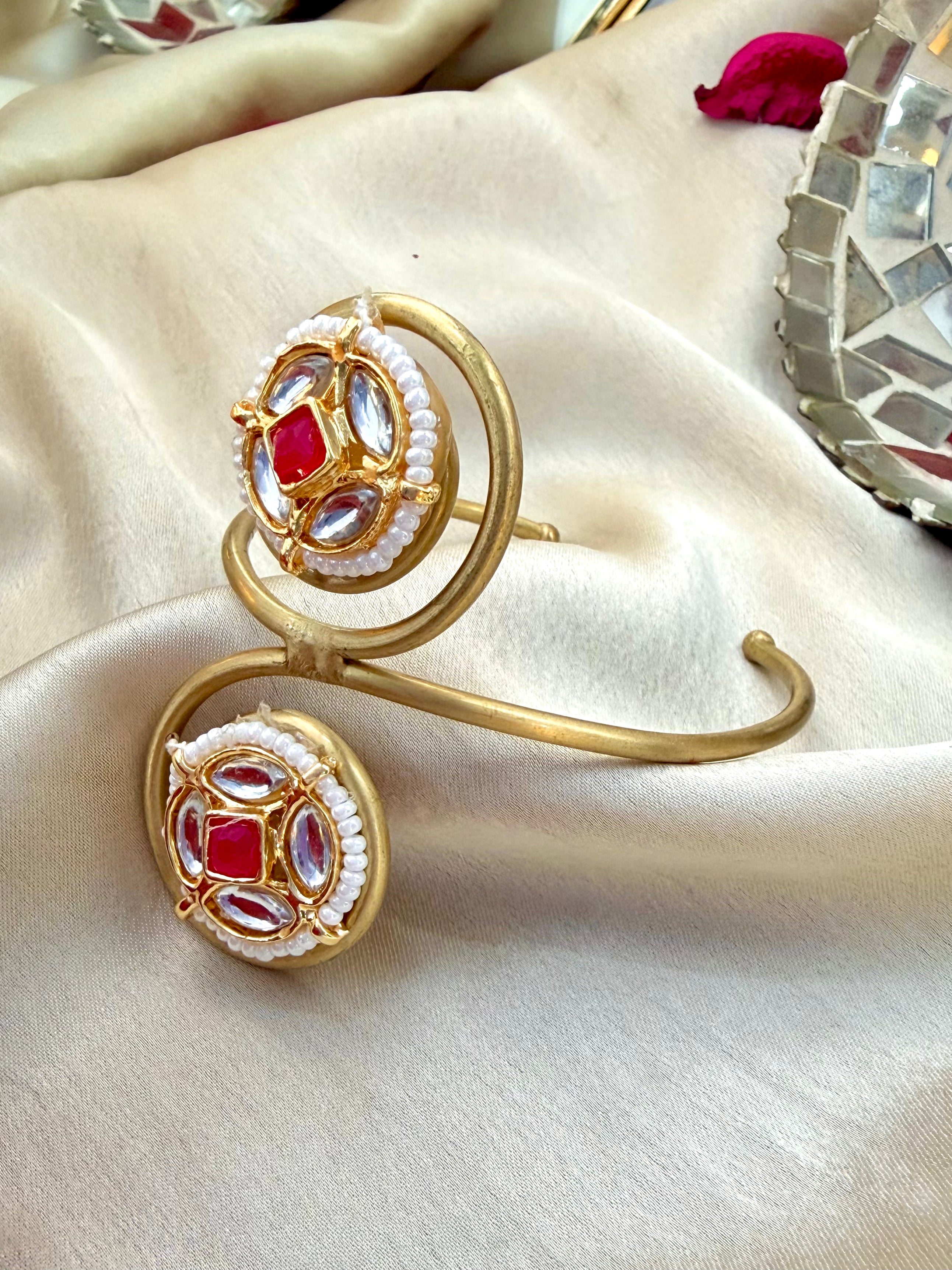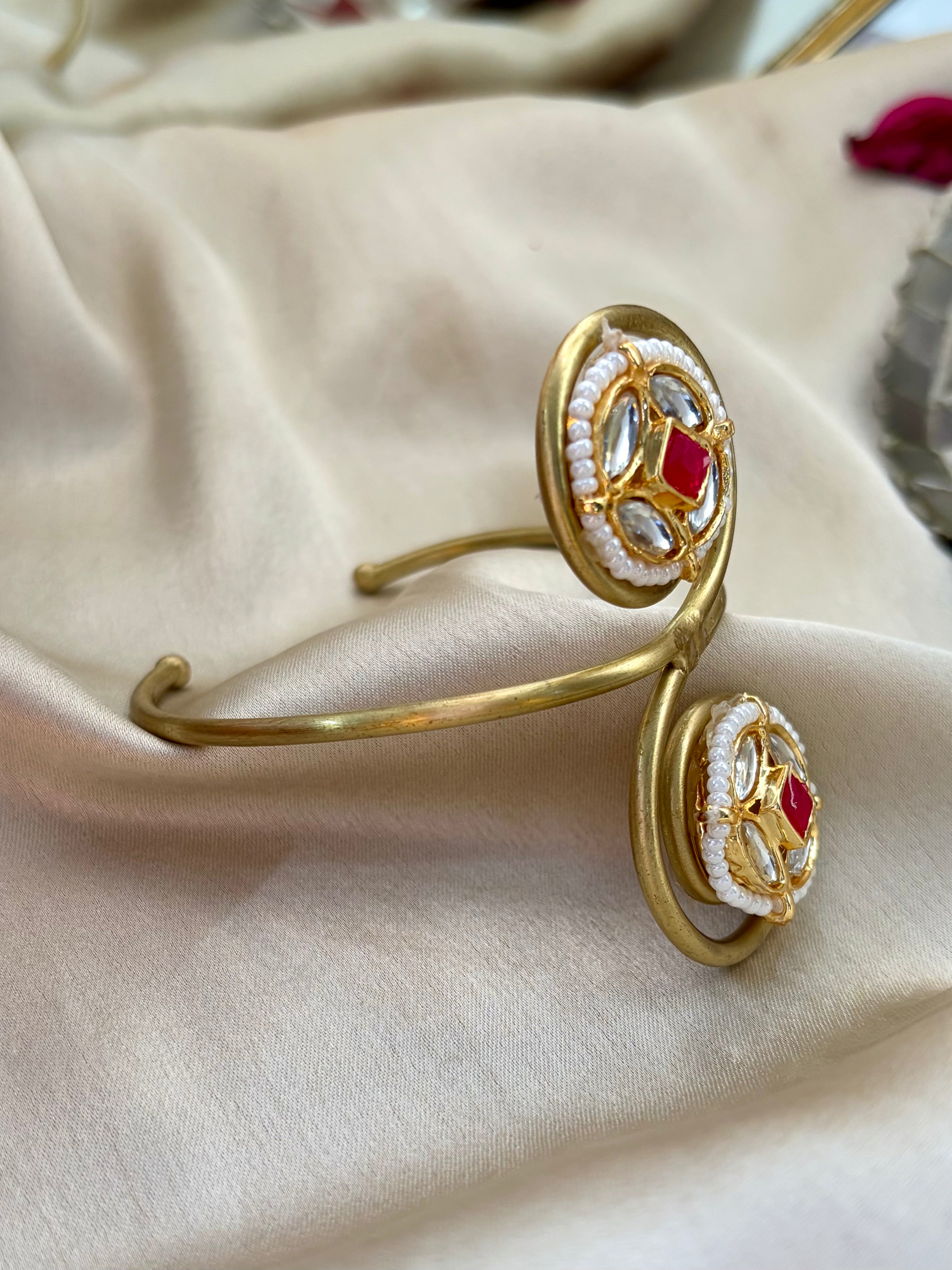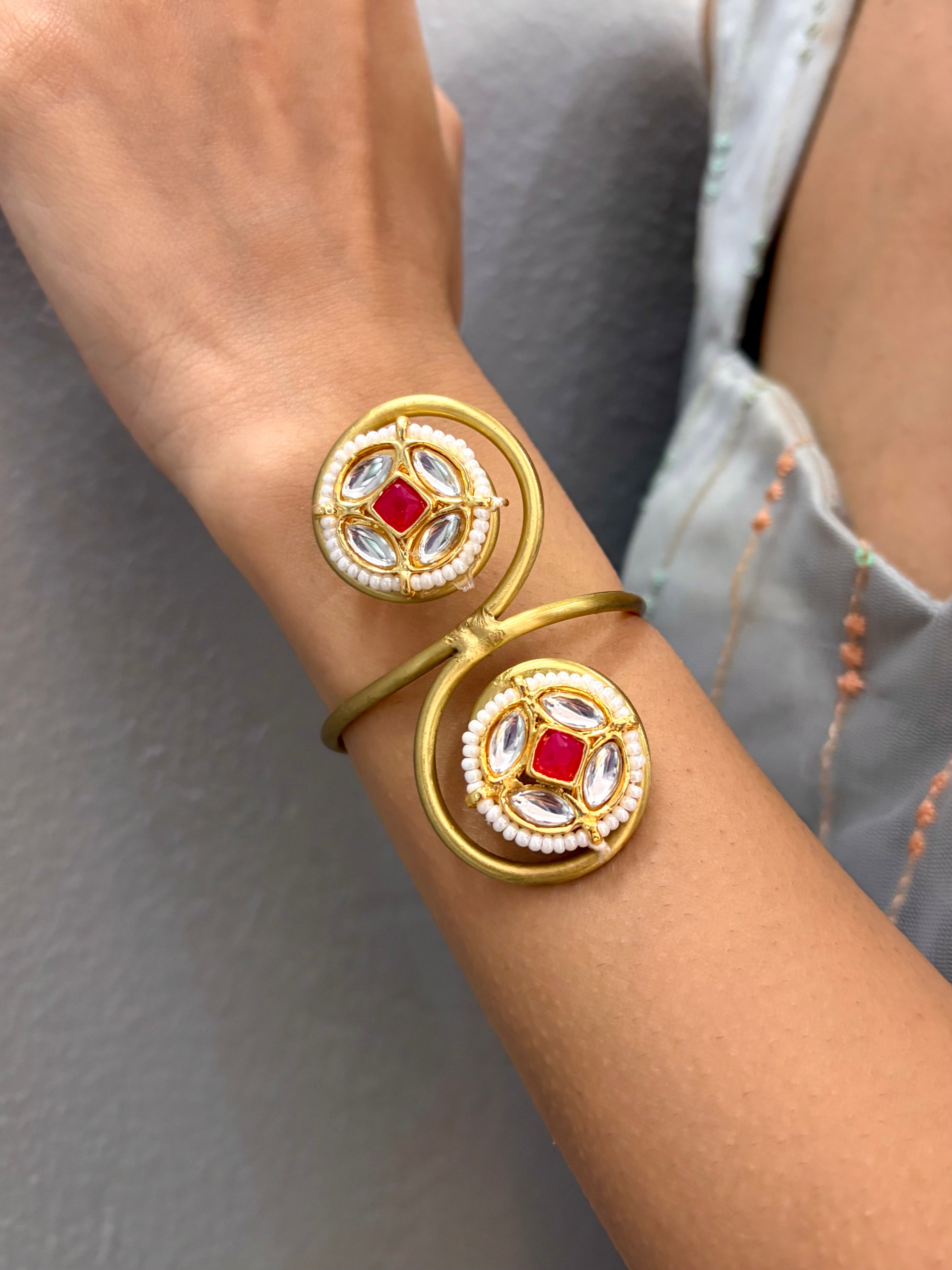 The Utsav Kundan Bracelet is a beautiful blend of traditional elegance and festive charm. Designed with two round kundan motifs, detailed with pearls and a striking red stone in the center, this openable bracelet instantly adds a royal touch to any outfit. Its lightweight and flexible fit makes it comfortable to wear for long hours during celebrations, weddings, and cultural events.