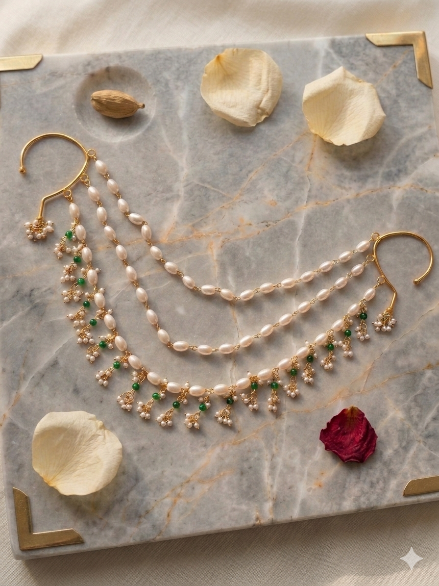 A statement kaan-chain that connects both ears with layered pearl strands and cute green-bead + moti jhumki drops. Gives full “shaadi guest / sangeet” energy instantly.