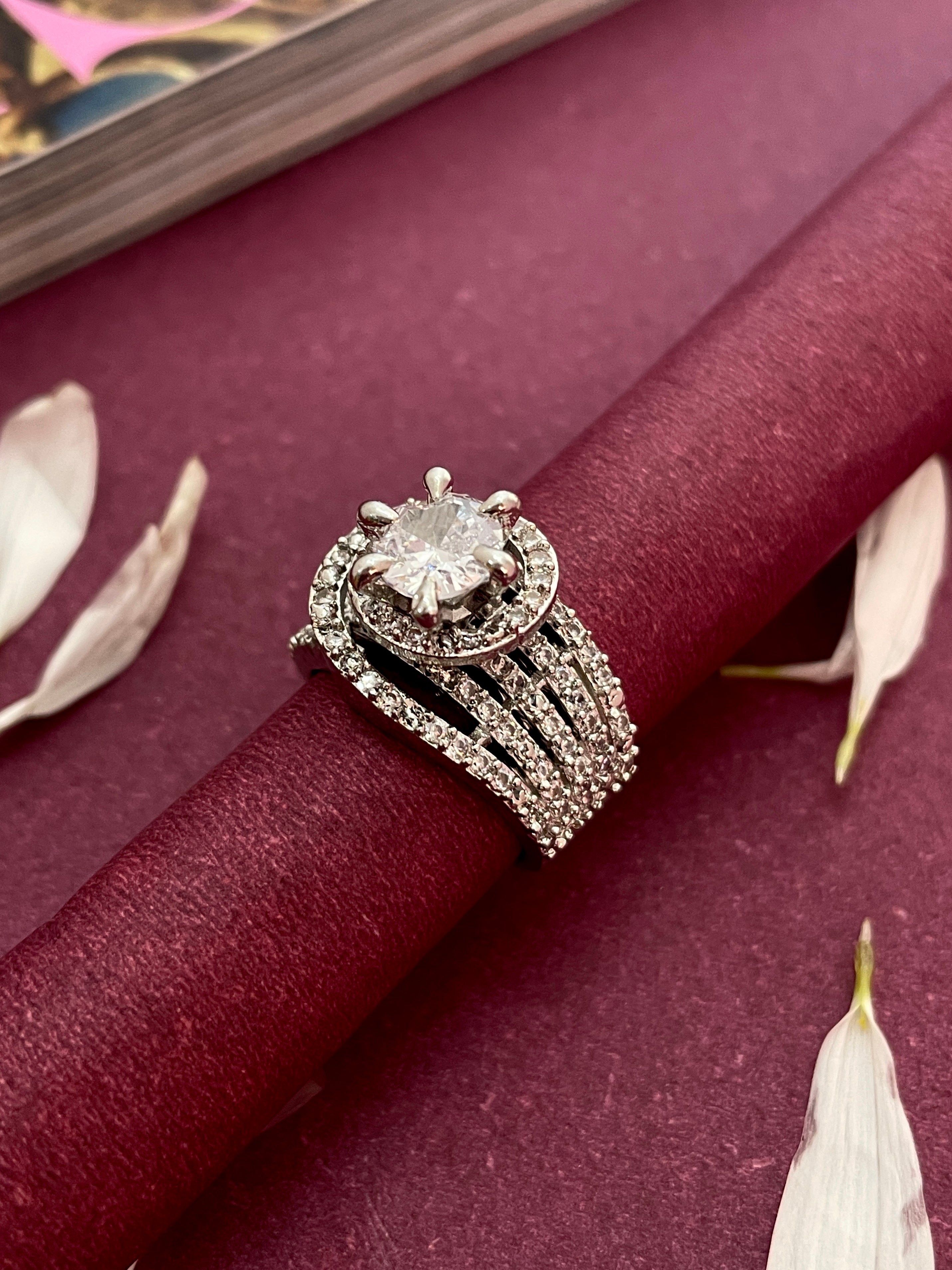 The Celestique AD Ring is a dazzling piece that combines shine with elegance. Designed with a brilliant solitaire at the center, surrounded by sparkling American Diamonds, it gives a luxurious and timeless look. Its adjustable band ensures a perfect fit, making it easy and comfortable to wear for any occasion.