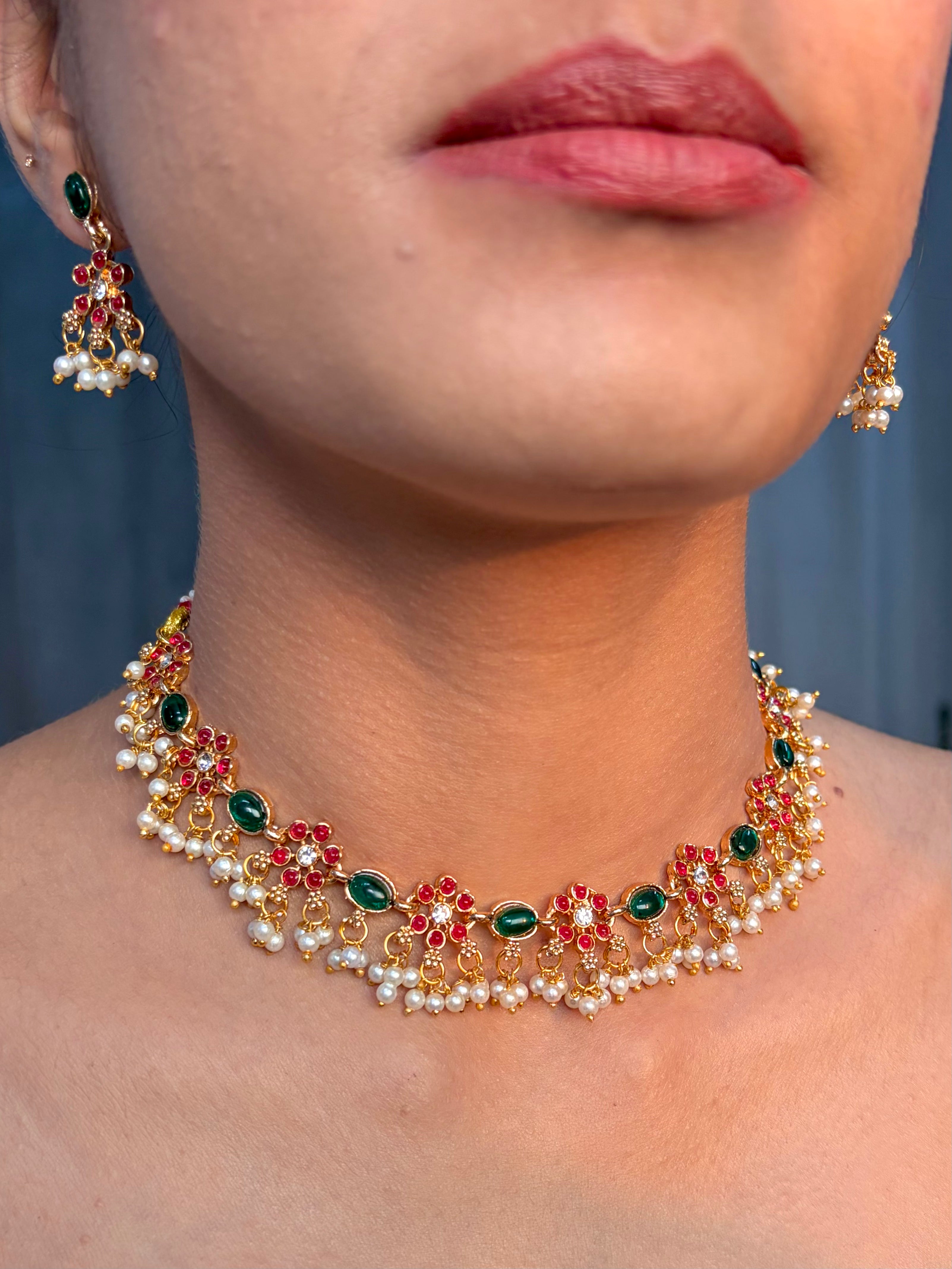 The Devika Kundan Necklace Set is a beautiful blend of tradition and elegance. Designed with classic red and green stones, detailed kundan work, and tiny pearl droplets, this set adds a rich and festive charm to any ethnic outfit. The necklace comes with matching earrings that complete your look effortlessly. Made with a stainless-steel base and an anti-tarnish finish, it stays shiny and long-lasting for years.