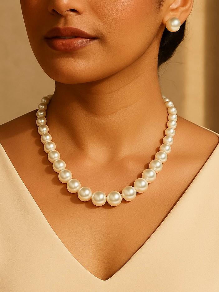 These Dew Pearl Necklace Set Designed with lustrous white pearls, this set includes a classic pearl necklace and matching stud earrings — perfect for any occasion, from festive celebrations to everyday wear. Its simple yet graceful design makes it a must-have for every jewelry lover.