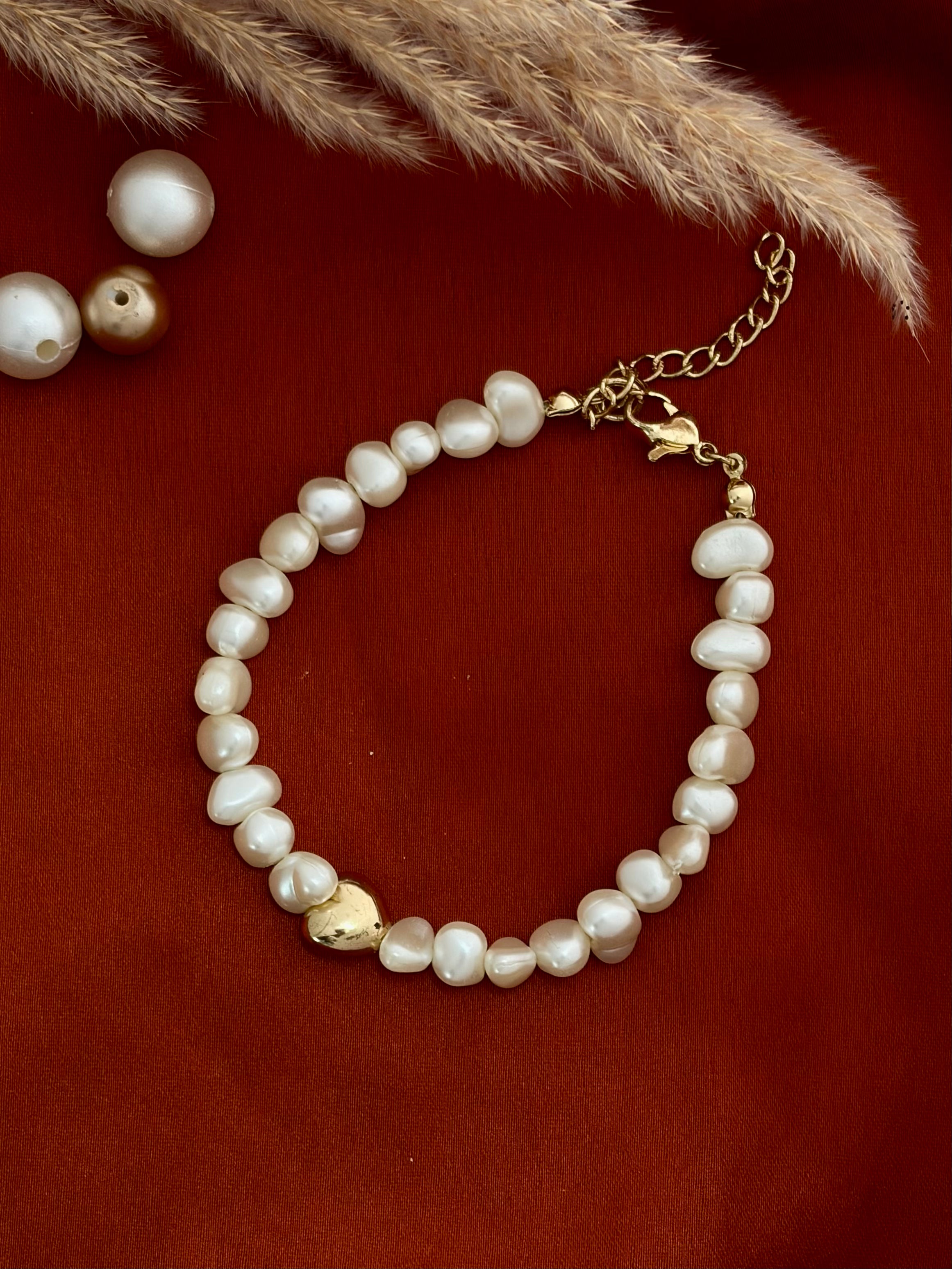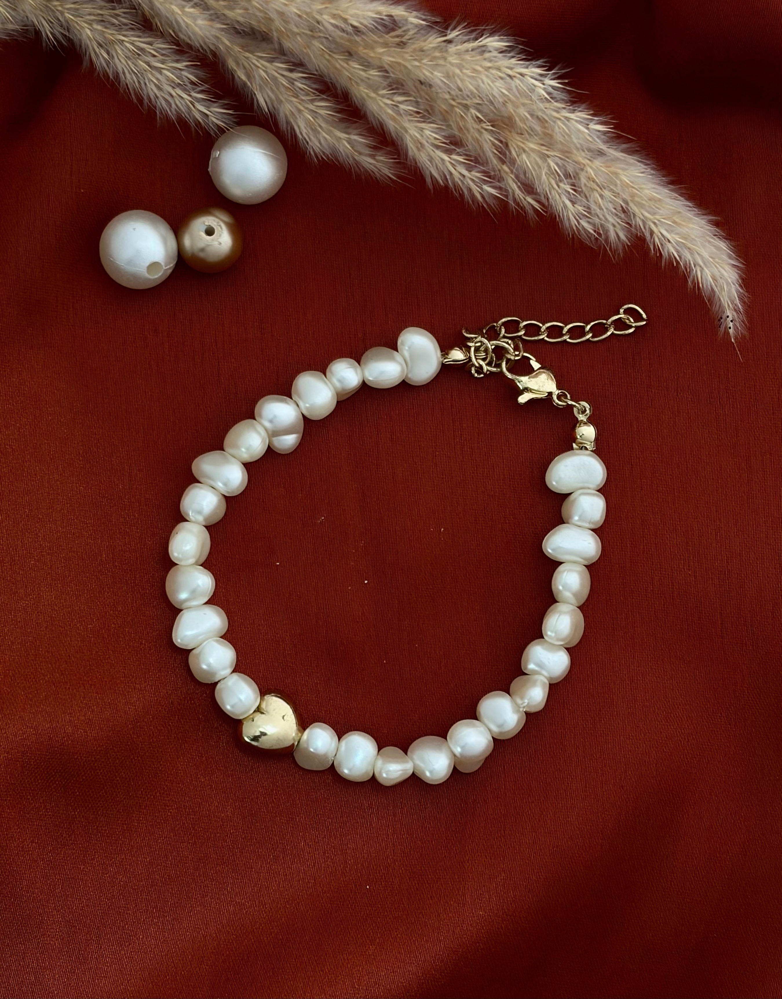 The Luna Love Bracelet is a sweet and elegant piece designed with white pearls and Gold-tone heart charm centerpiece. Each pearl has a unique shape, giving the bracelet a natural and stylish look. The golden heart adds a touch of love and warmth, making it perfect for everyday wear or as a special gift.