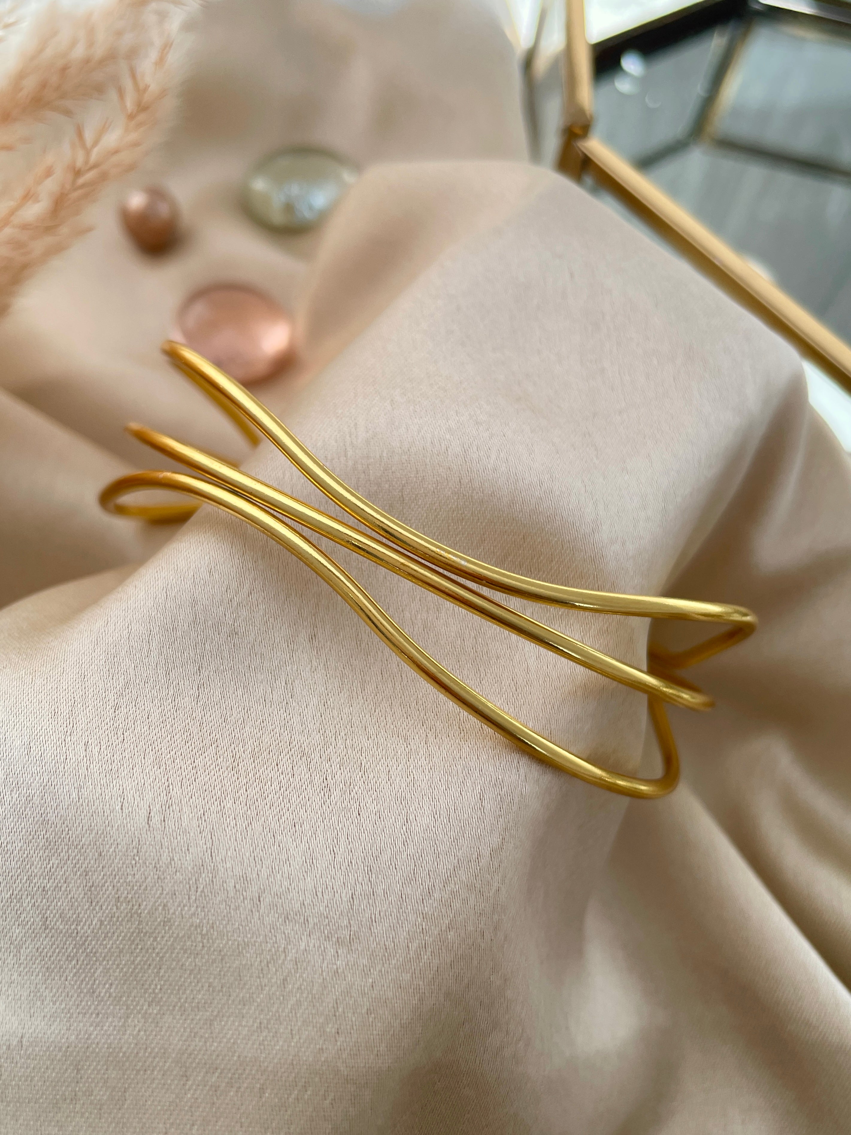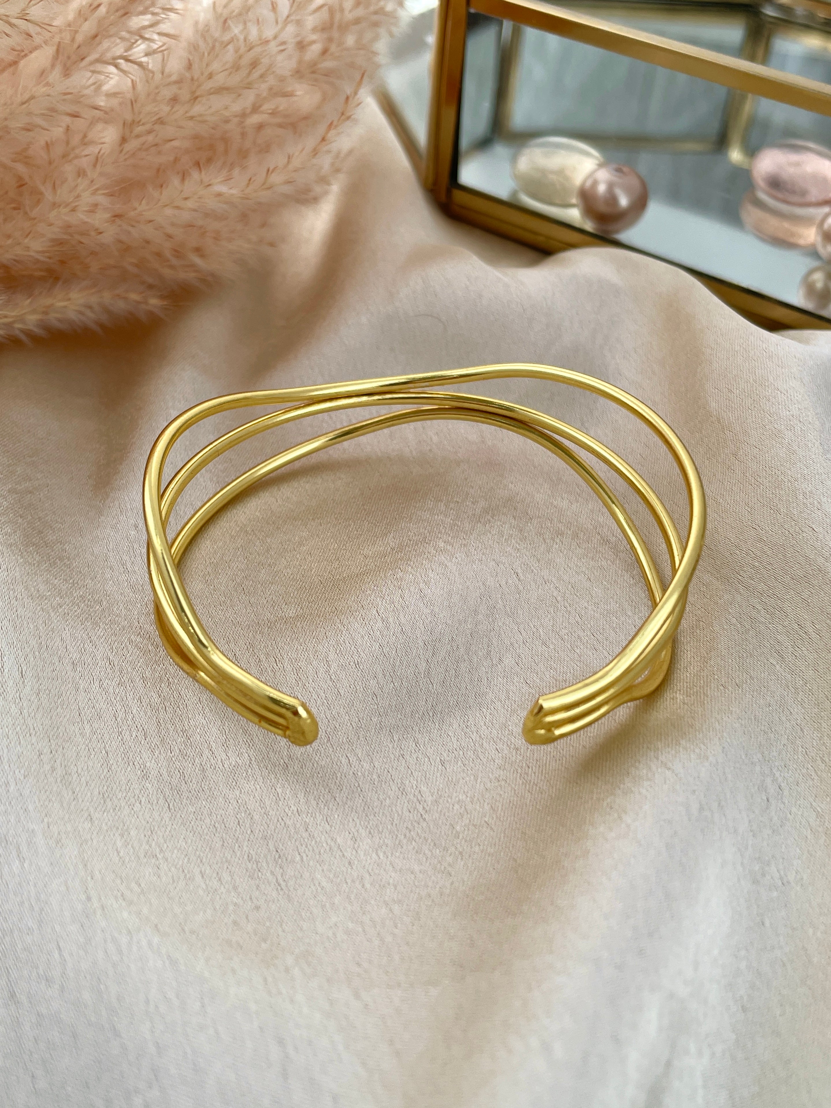 This Luster Lines bracelet features Open cuff design with criss-cross layered in polished gold. and Lightweight and comfortable to wear.