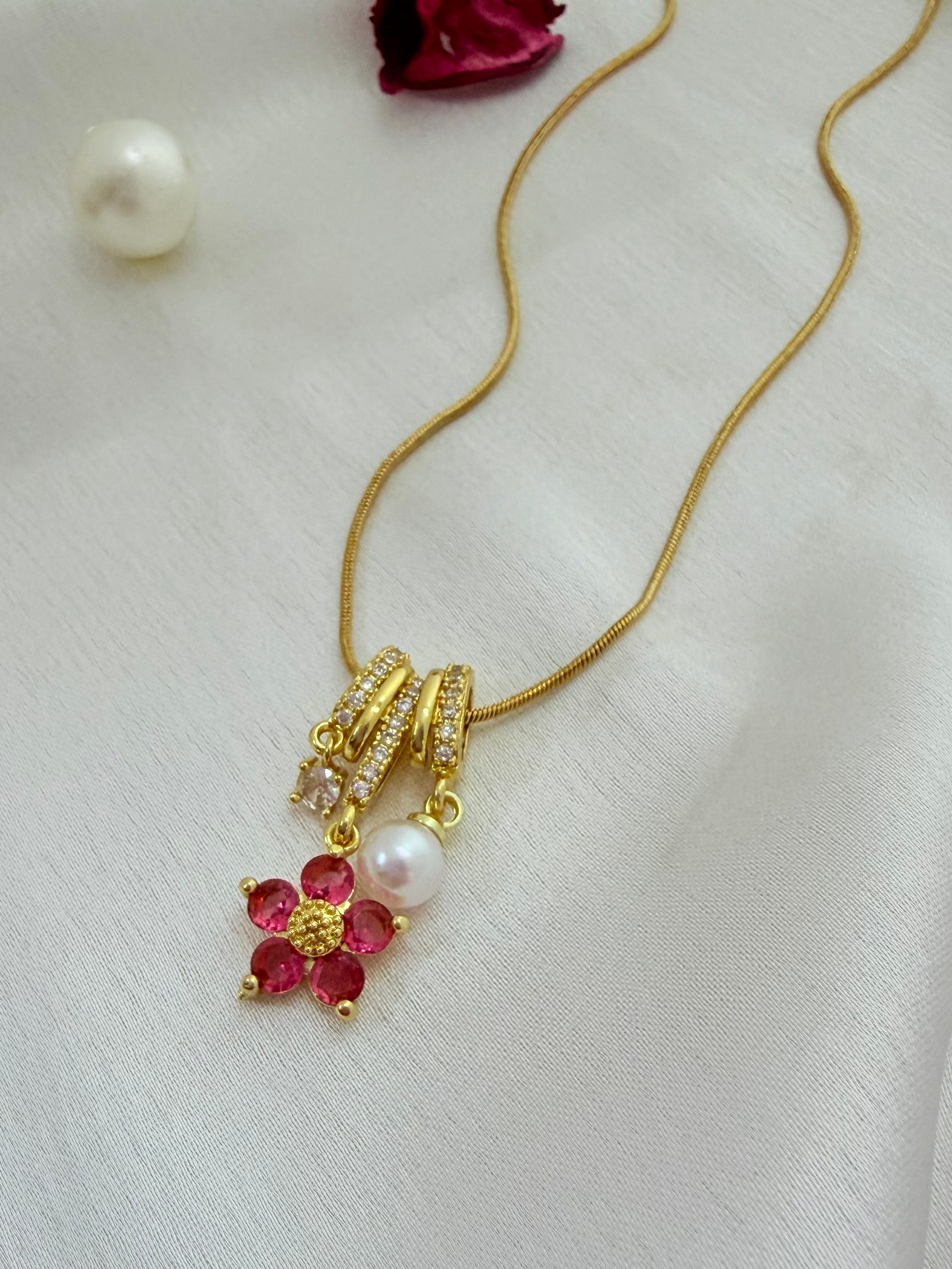 The Pearl Blossom Chain is a soft and elegant necklace designed to add a touch of charm to your daily style. It features a sleek gold chain paired with pretty charms — a delicate pearl drop and a tiny floral charm with pink stones. Light, feminine, and versatile, this chain instantly brightens up any outfit.