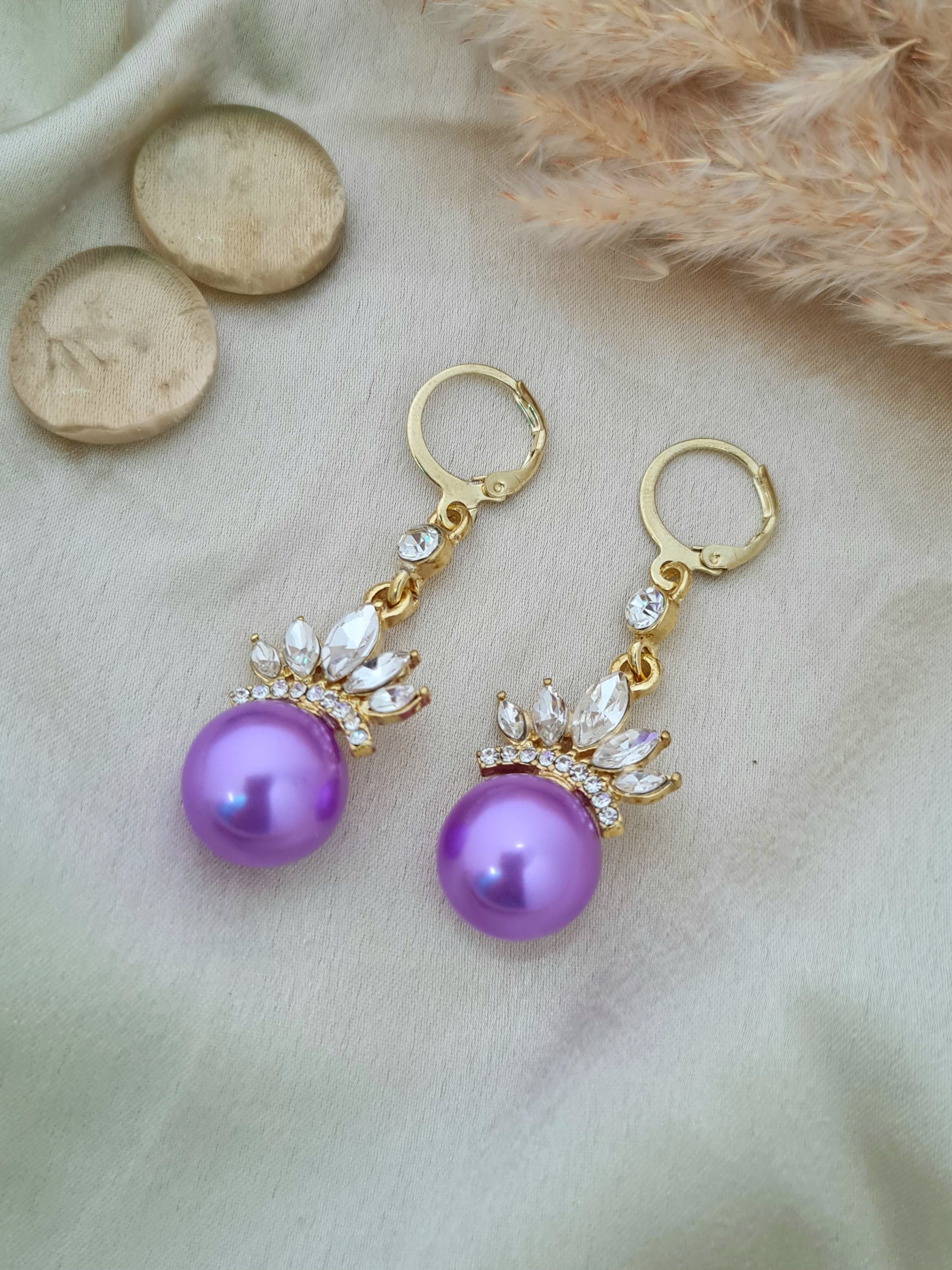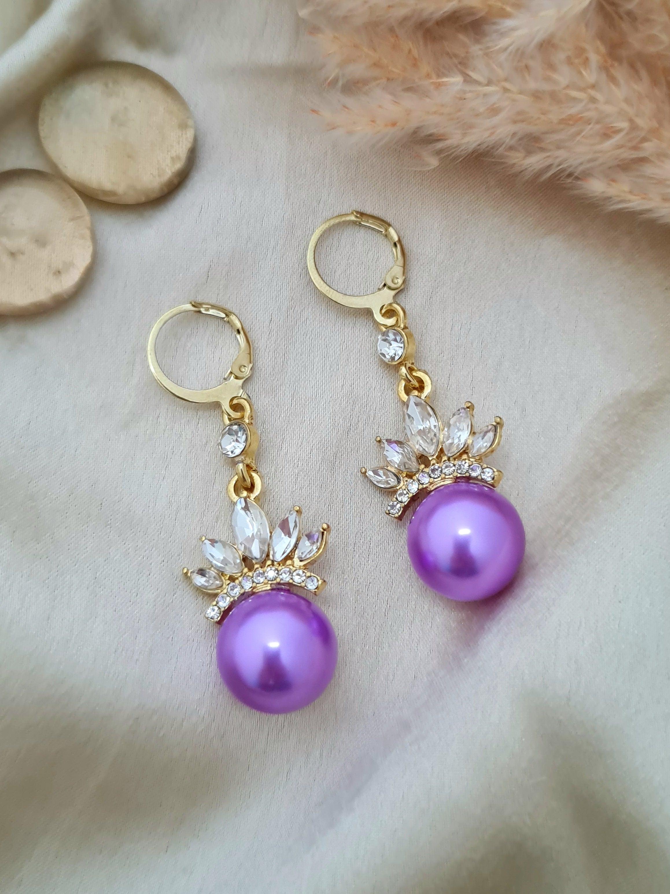 The Pearl Crown Dangler Earrings are a beautiful mix of elegance and charm. Featuring a glossy lavender pearl topped with sparkling crystal stone detailing shaped like a crown, these earrings add a royal touch to any look. Lightweight and eye-catching, they are perfect for parties, weddings, or any special occasion where you want to stand out with grace.