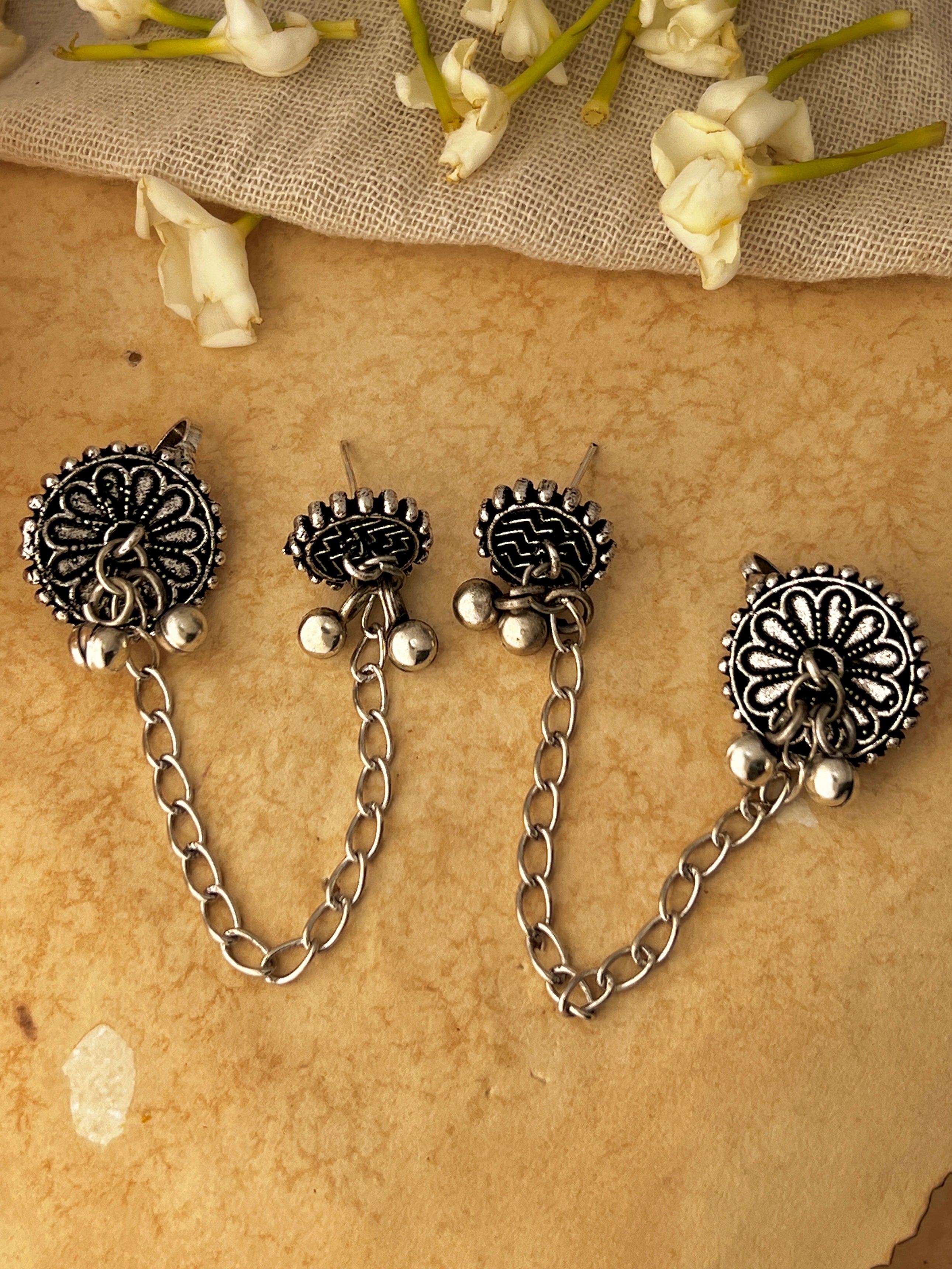 These oxidised silver chain earrings feature intricate circular motifs connected by a delicate chain.
