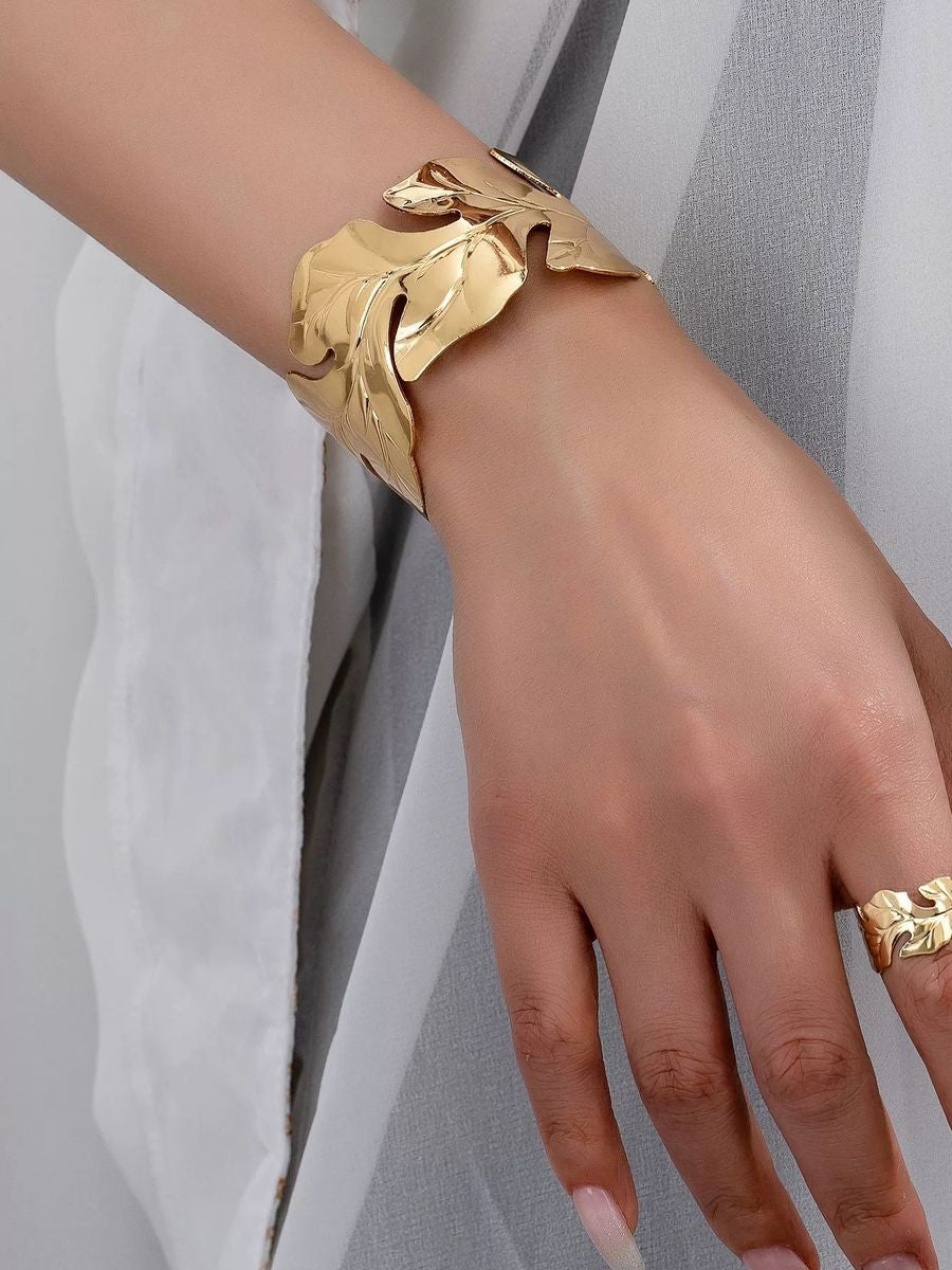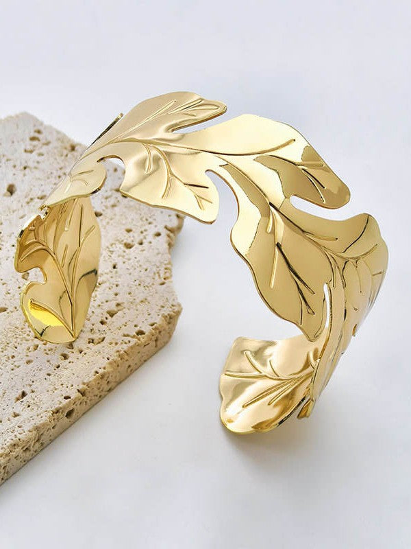 The Regal Leaf Cuff Bracelet is a bold and elegant statement piece inspired by nature. Designed with beautifully carved leaf patterns, this cuff adds a touch of royalty and charm to your look. Its open cuff style makes it comfortable to wear and perfect for dressing up any outfit with a classy golden shine. Adjustable in size.