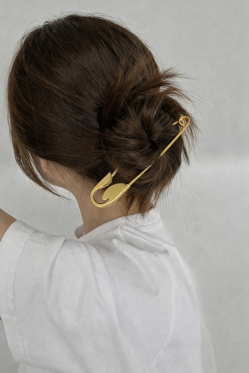 The Safety Pin Hair Clip is a stylish and trendy hair accessory designed in a unique safety pin shape. Its sleek gold finish gives a bold yet minimal look that easily stands out. Lightweight and easy to wear, this hair clip adds a cool statement to your hairstyle while keeping your hair neatly in place.