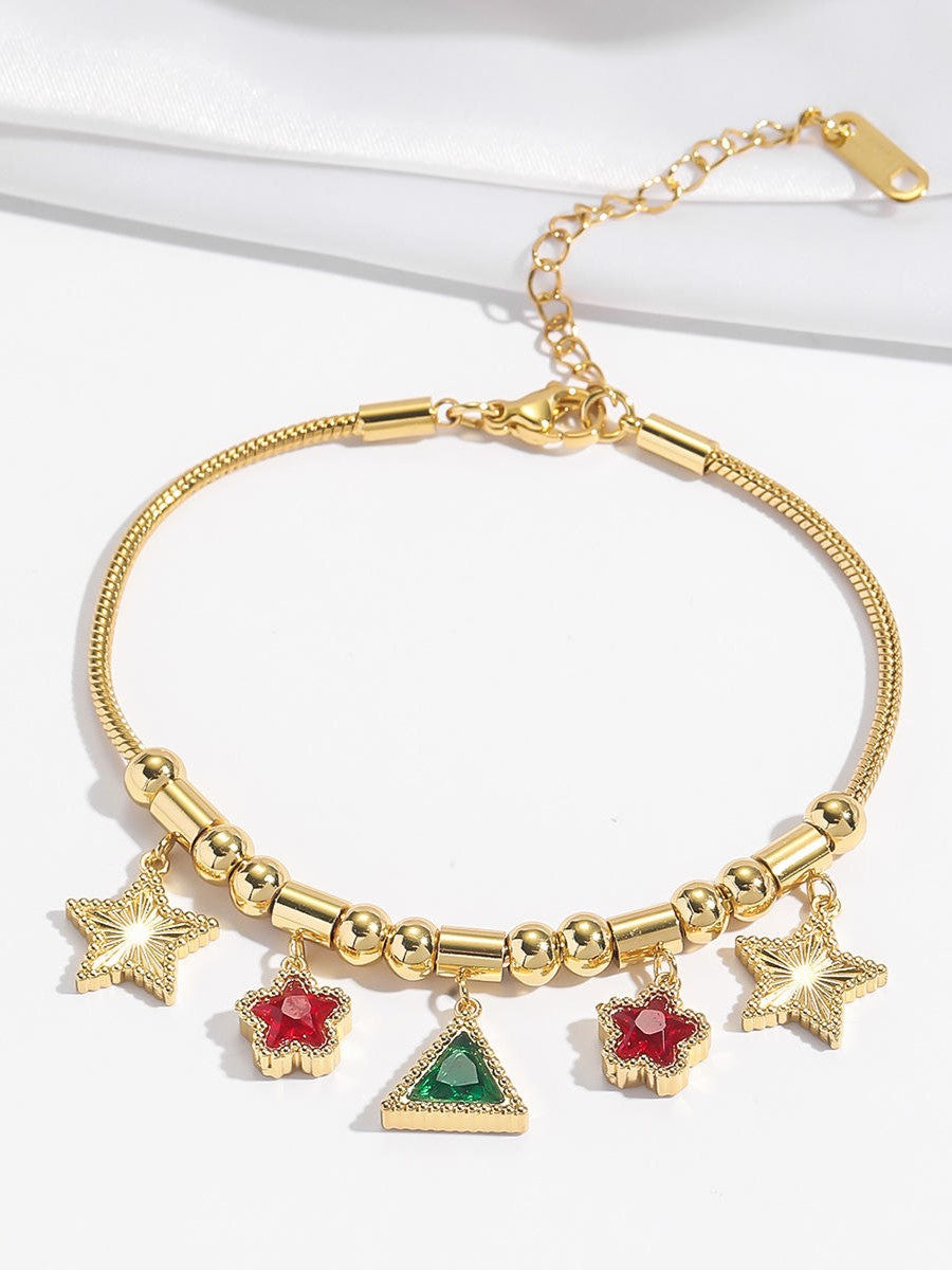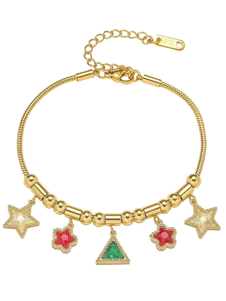 The Starstruck Charm Bracelet brings a playful sparkle to your everyday and festive looks. Featuring dainty star, flower, and triangle charms in red and green tones, it adds the perfect pop of color and shine to your wrist. Lightweight and stylish, this bracelet is perfect for casual wear, parties, or gifting.