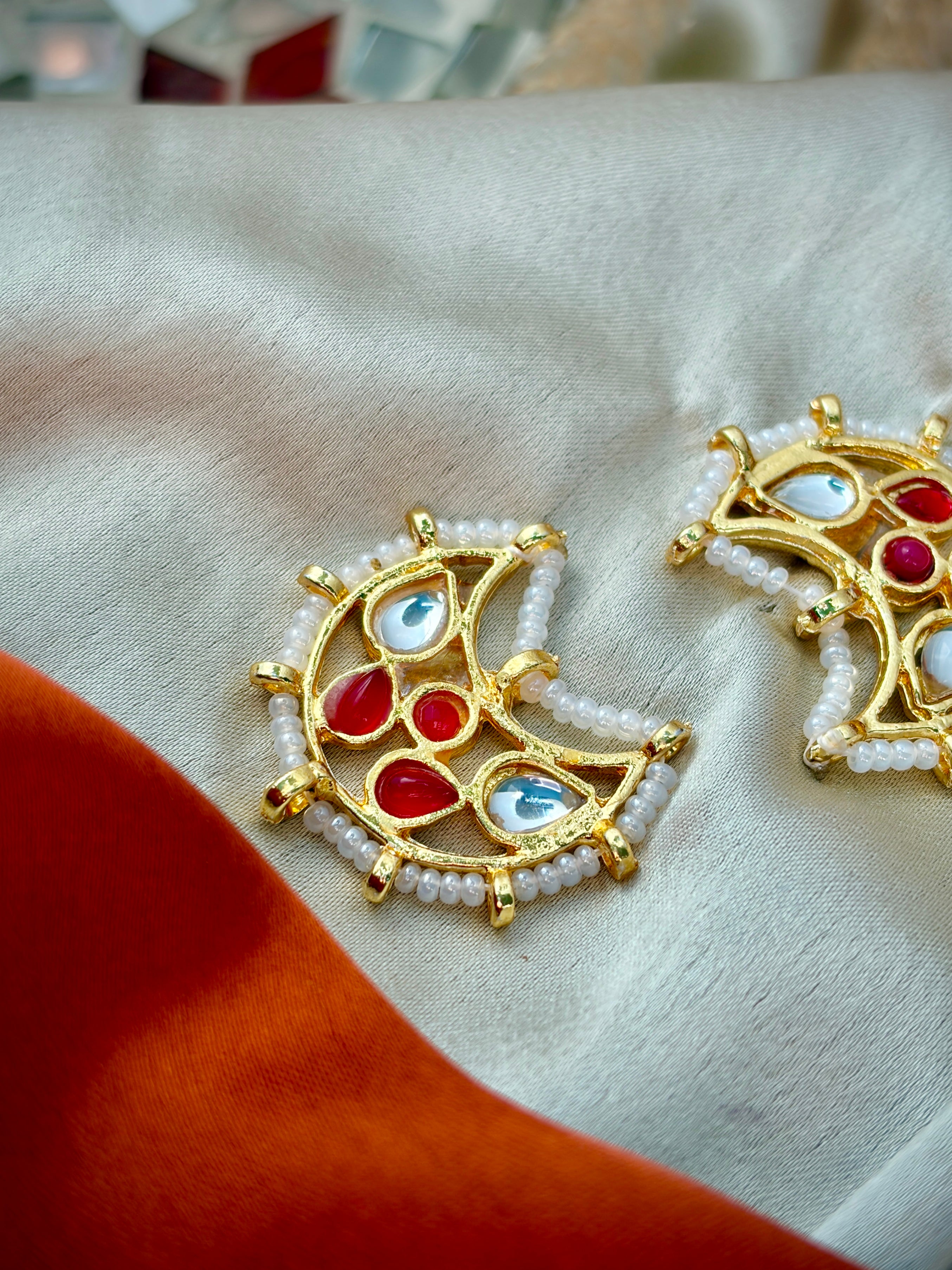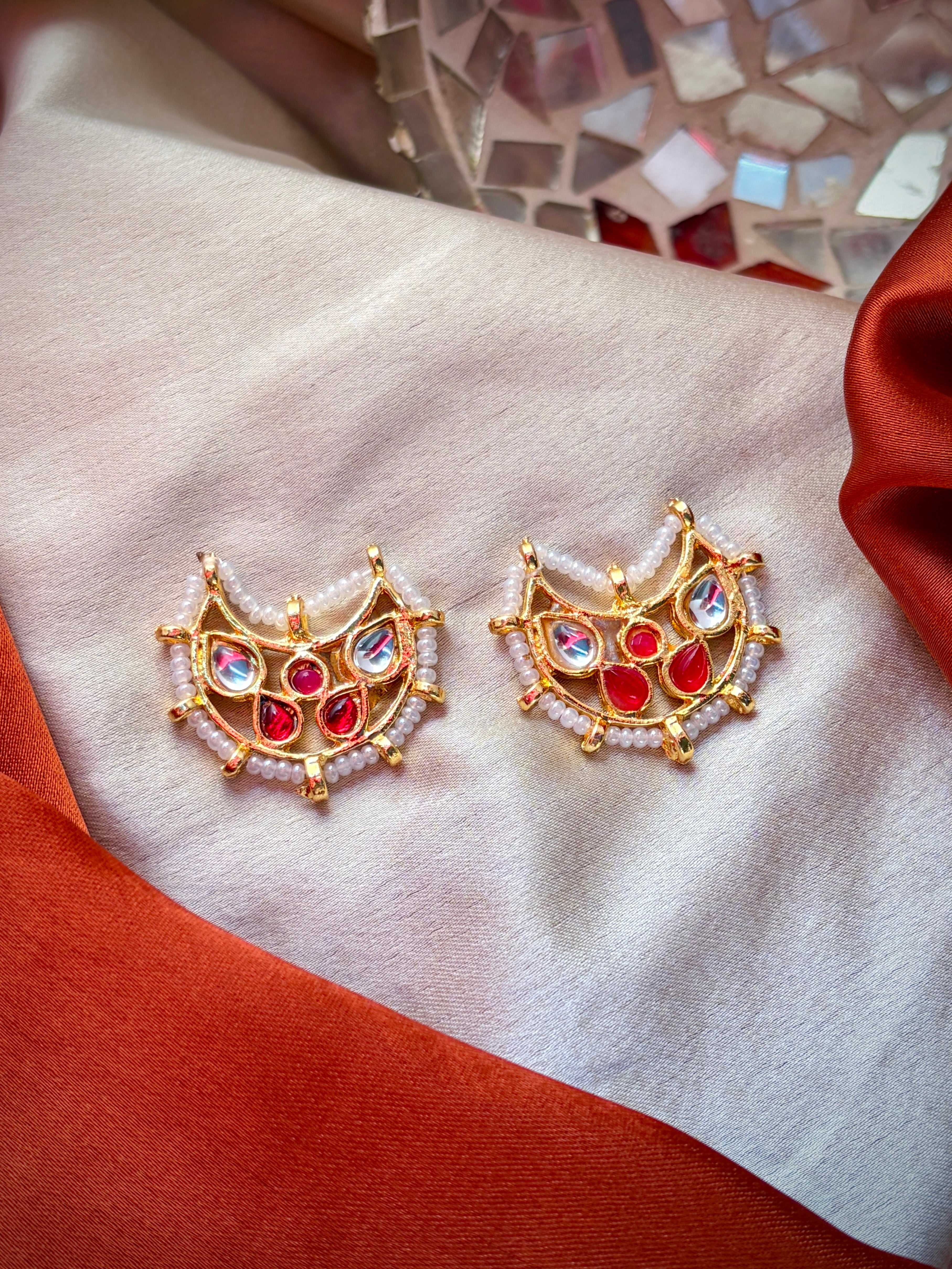 Ziya Kundan Earrings are a beautiful blend of traditional charm and modern style. Designed in a crescent shape with red and white kundan stones, these earrings give a rich and festive look. The delicate pearl detailing adds softness and elegance. They are perfect for weddings, festivals, and special occasions when you want to stand out.